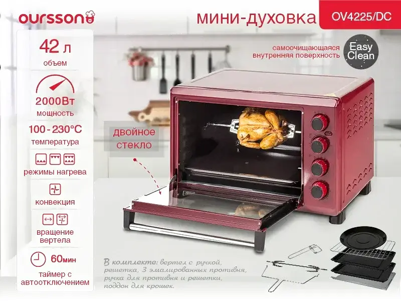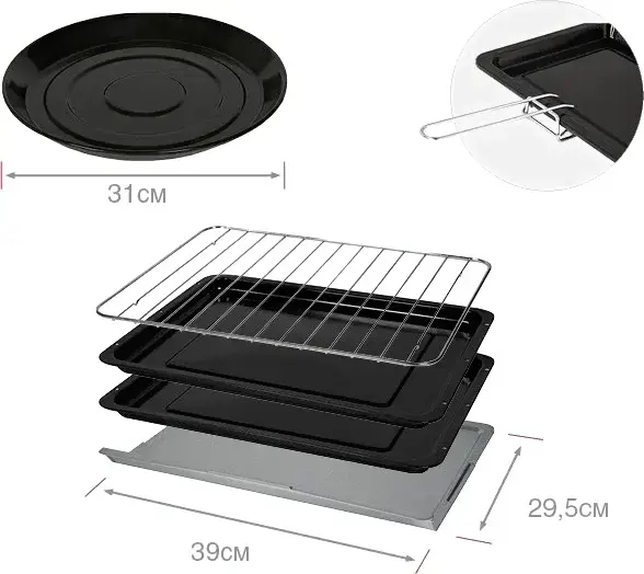 • В комплекте вертел, решетка, съемный поддон (для крошек), противень, ручка для снятия противня/вертела, рукоятка вертела