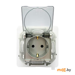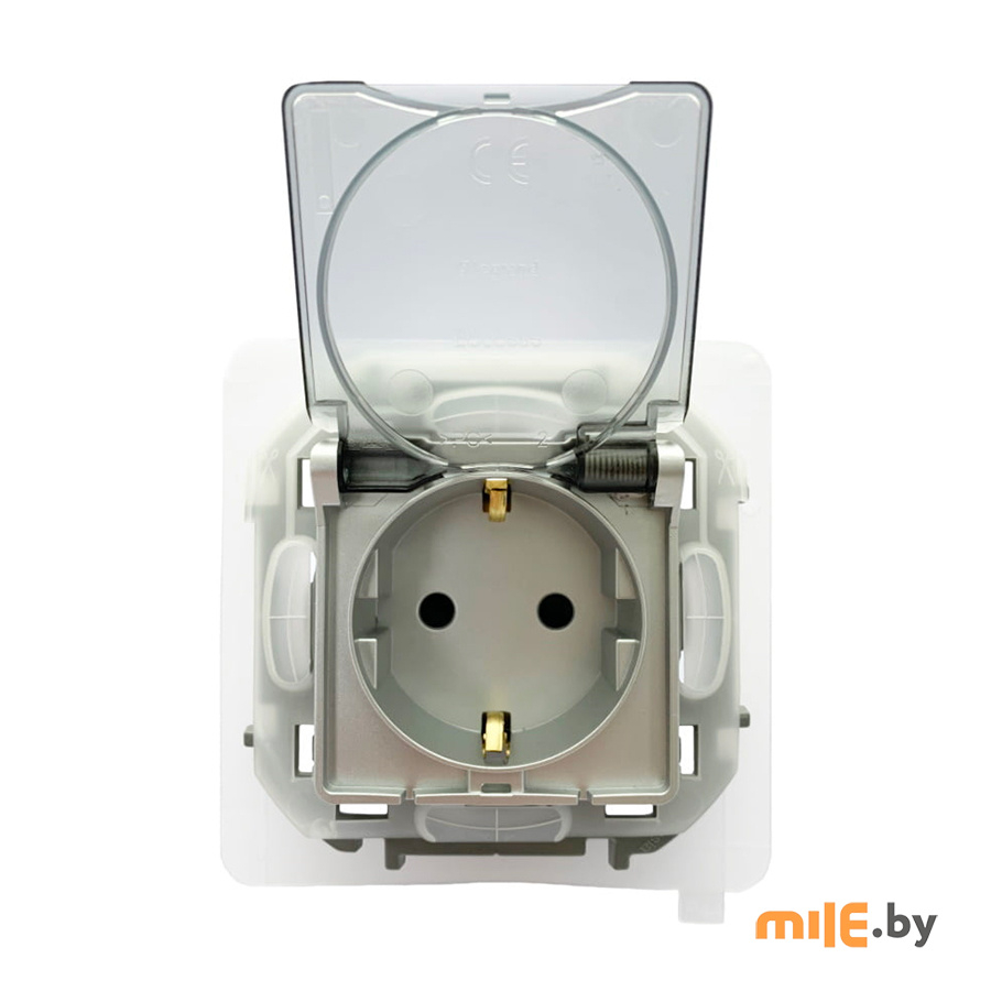 Розетка с заземлением, защитной крышкой и интегрированными защитными шторками Legrand Inspiria для скрытого монтажа , степень пылевлагозащиты IP44. Максимальный ток 16 А, напряжение ~250В, максимальная мощность 3680 Вт.