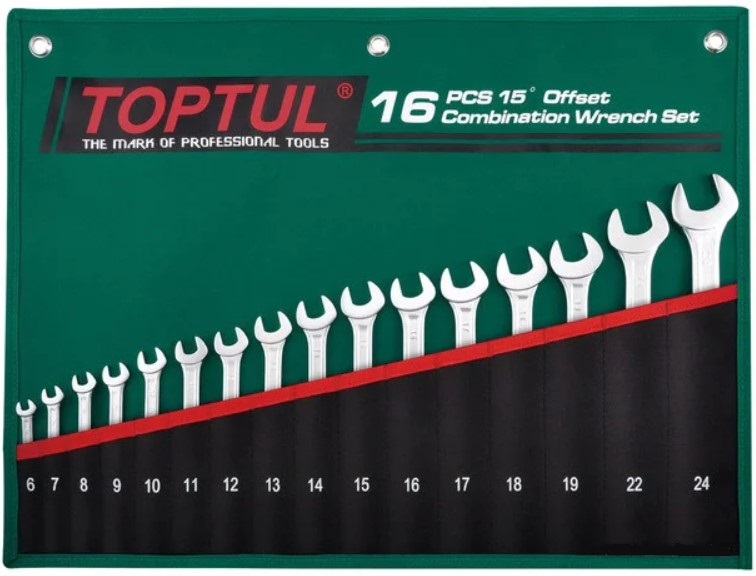 - Название и артикул Набор ключей комбинированных 6-24 мм 15° Pro-Line 16шт. в сумке TOPTUL (GRAW1601)