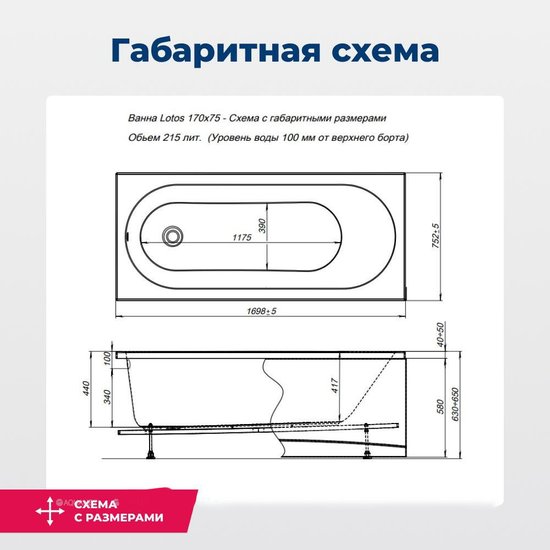 • Глубина ванны 44 см