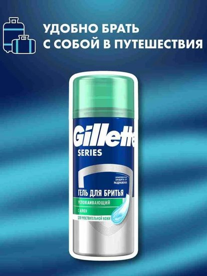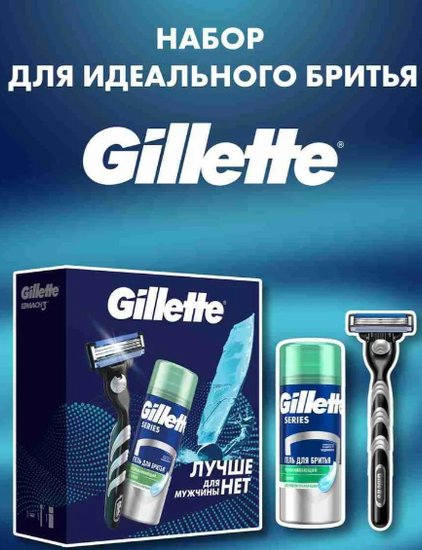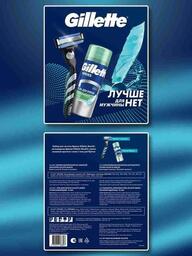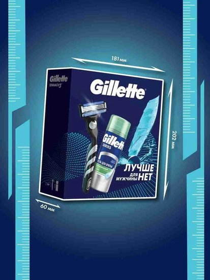 • Содержание набора бритвенный станок Gillette Mach3 1 шт., 1 сменная кассета (надета на станок), успокаивающий гель для бритья Gillette Series, 75мл