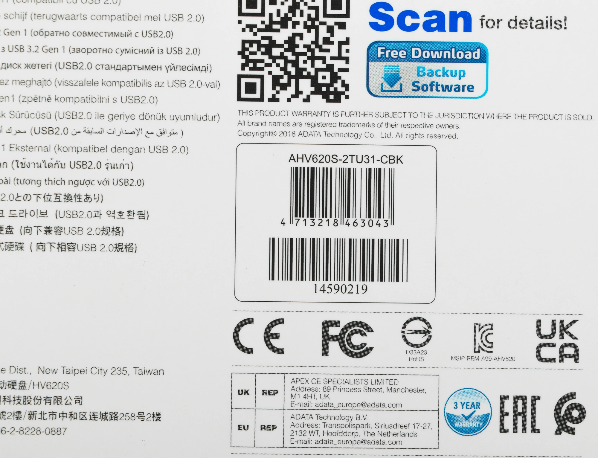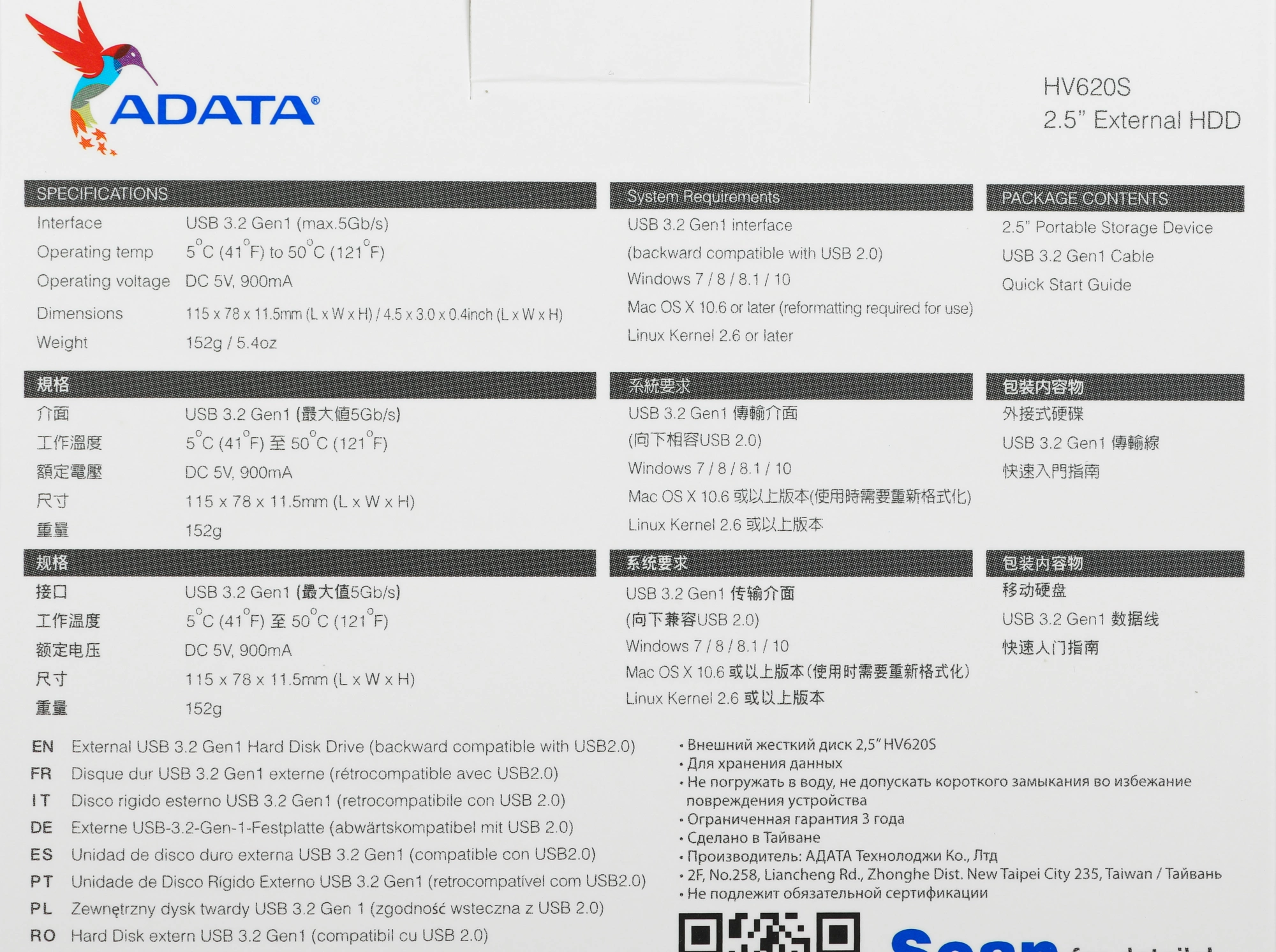 Жесткий диск A-Data USB3.1 2TB AHV620S-2TU31-CBK HV620S 2.5" черный
