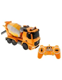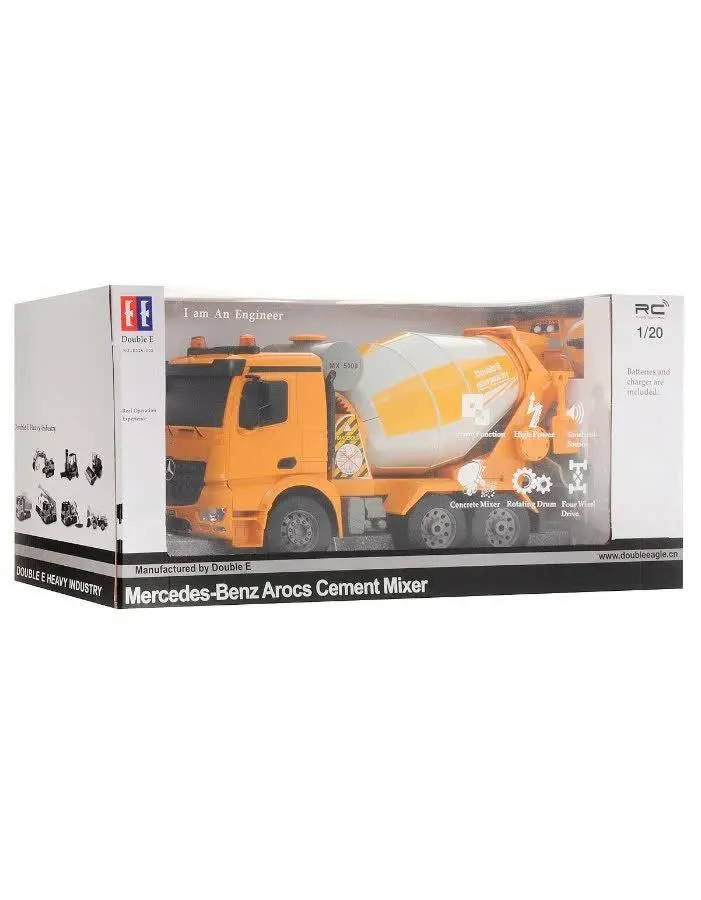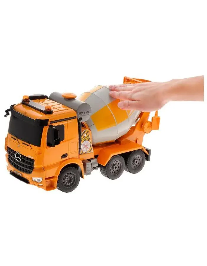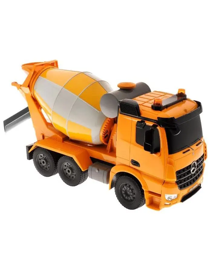 Радиоуправляемый бетоновоз MercedesBenz Actros - точная полноприводная копия своего прототипа в масштабе 1:20., Модель оснащена электродвигателем. Экстерьер хорошо детализирован., Антенна встроена в корпус. 4-х канальная радиоаппаратура работает на частоте 2,4Ггц и обеспечивает бесперебойную маневренность автомобиля влево, вправо, назад и вперед, прокручивание цистерны. Звуковое сопровождение с регулируемой громкостью имитирует характерные звуки при каждом маневре. Так же предусмотрена подсветка фар., Преимуществом радиоуправляемых моделей является стимулирование развития у ребенка мелкой моторики, логики, координации движения и пространственного мышления., Такая игрушка без сомнения станет любимым развлечением и позволит вашему ребенку «примерить на себя» роль одной из социально-важных профессий.