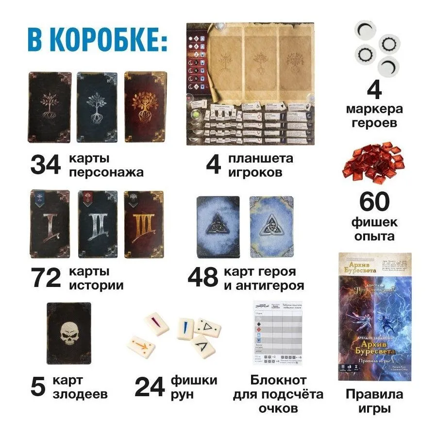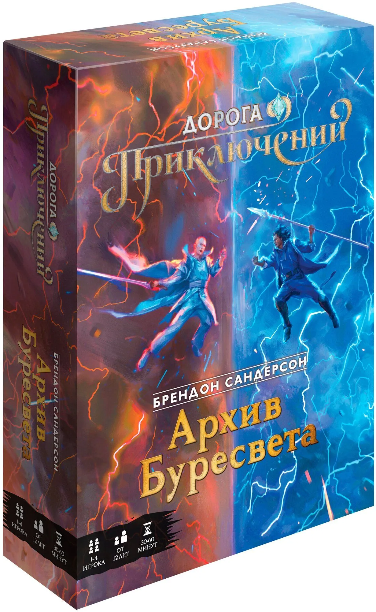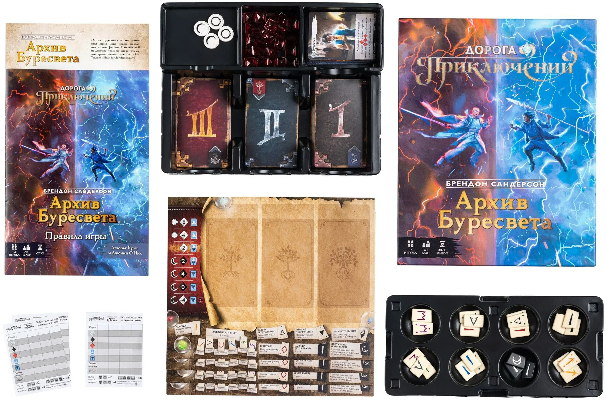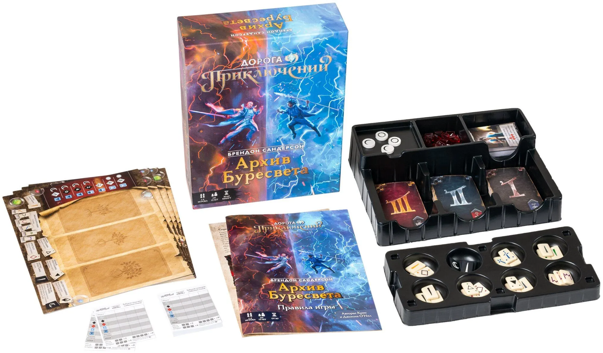 Архив Буресвета – это это самостоятельное продолжение героического фэнтези Дорога Приключений, но теперь в духе книжной вселенной Брендона Сандерсона. Перед вами раскинется увлекательный мир Рошара, полный как поджидающих вас опасностей, так и удивительных подвигов, что будут под силу только настоящим героям. Раскрывайте свое прошлое, приобретайте черты характера, проходите множество испытаний, заводите товарищей по странствиям, читайте свою судьбу через броски рун и, конечно же, выбирайте сторону Света или Тьмы! Иллюстрации в стиле известной книжной вселенной, новая механика знака Сияющих и идеально сбалансированный кооперативный режим окажутся ценной находкой как для искушенных игроков, так и для тех, кто только начинает свой настольный путь.