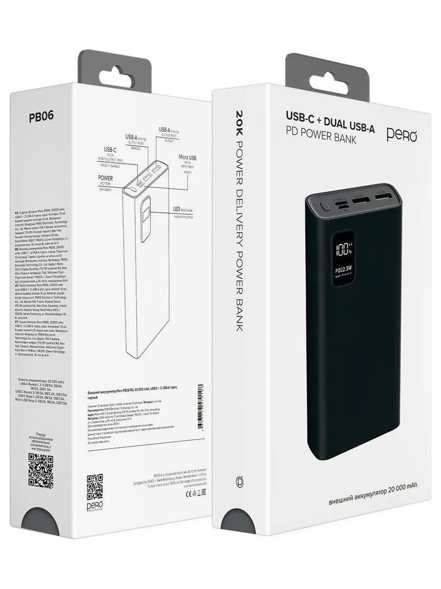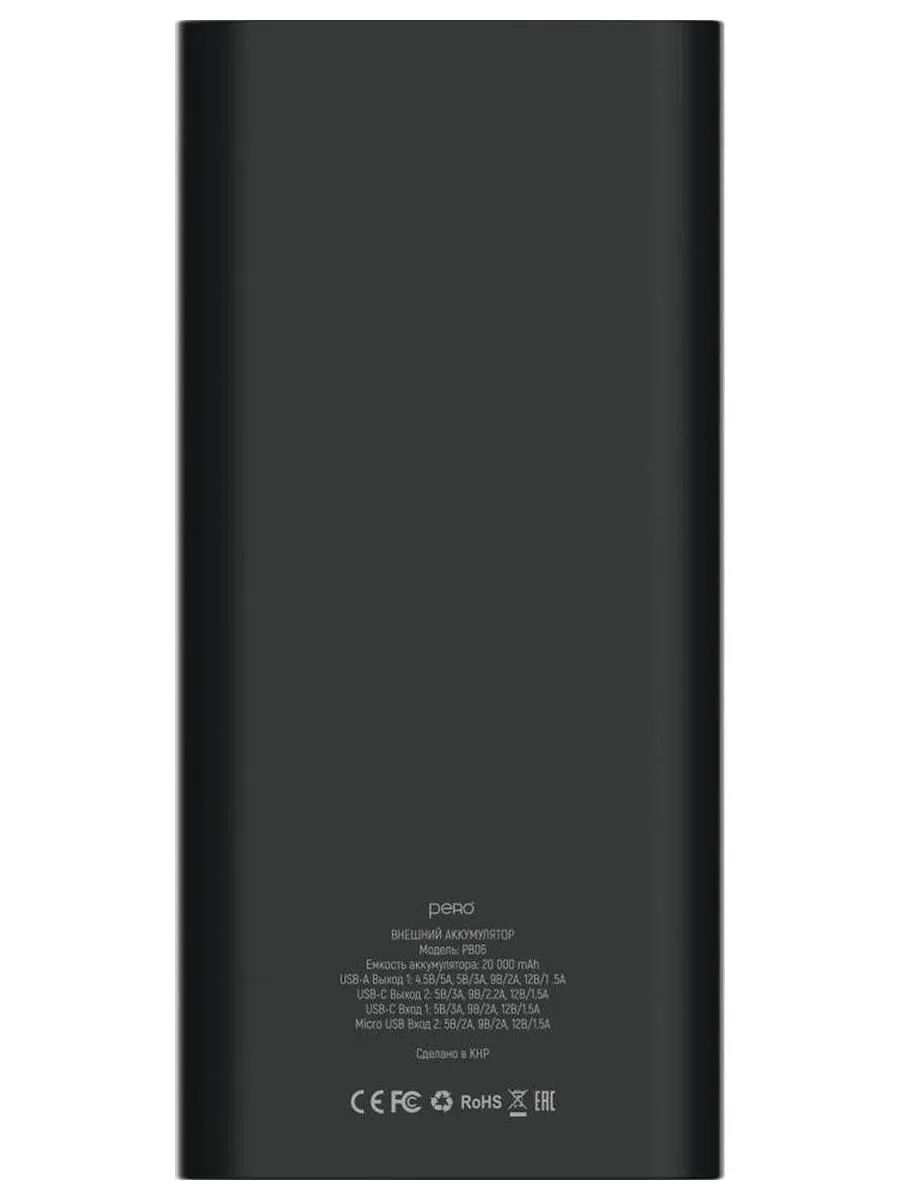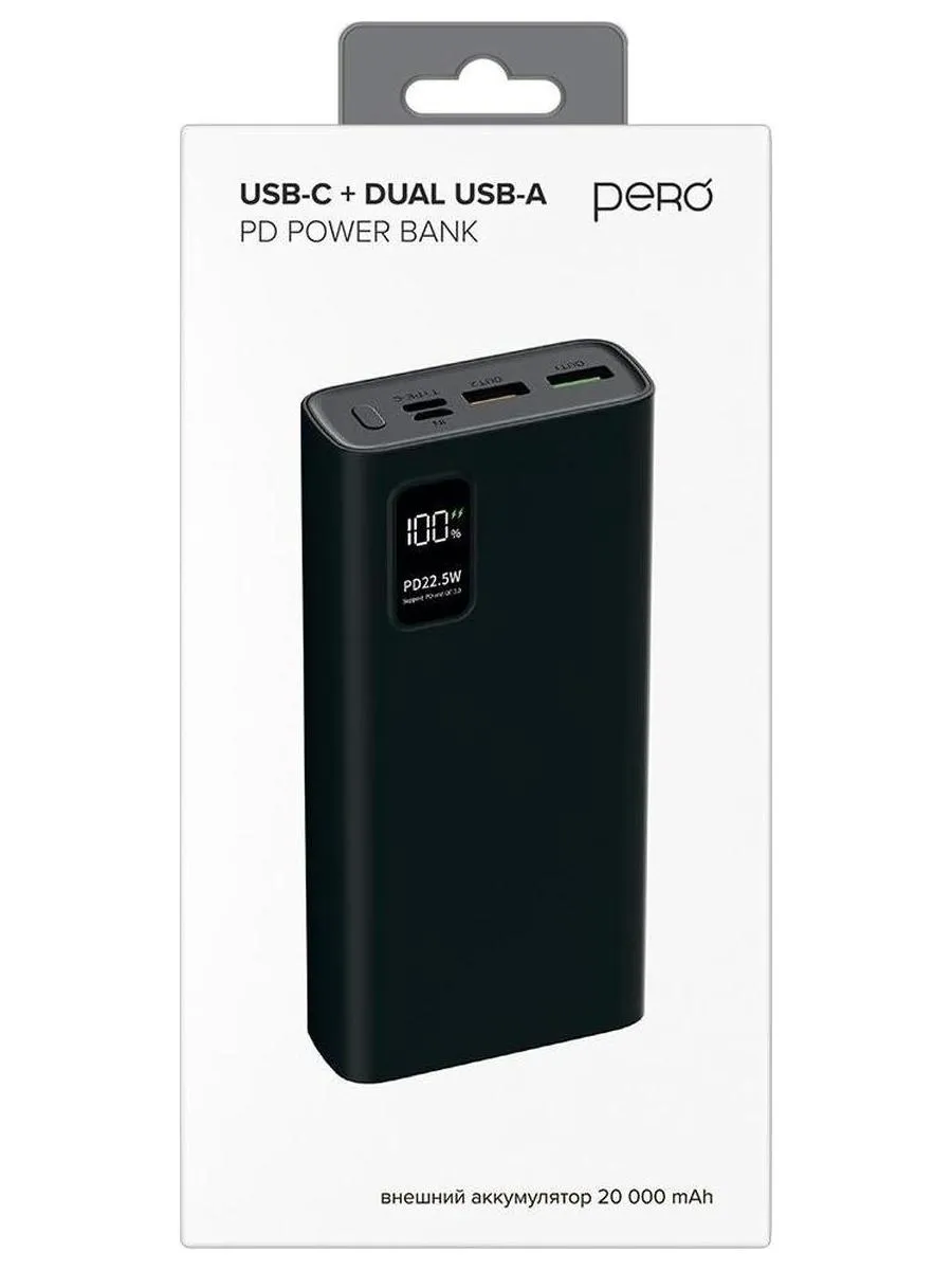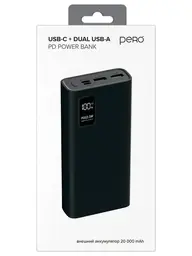 Описание товара Внешний аккумулятор PERO PB06 20000 mAh, Li-Pol, output USB-C + 2 USB-A, черный