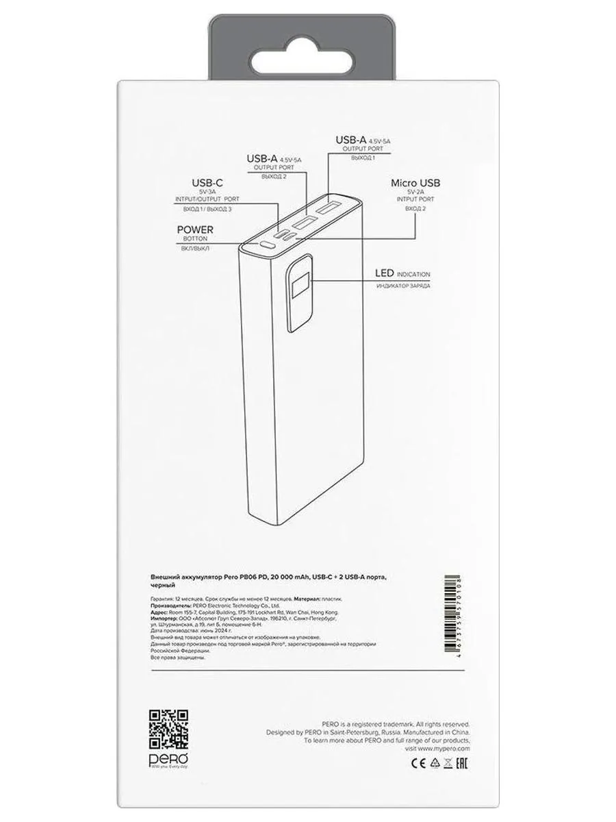В наличии 1 100 руб. Внешний аккумулятор PERO PB06 20000 mAh, Li-Pol, output USB-C + ...