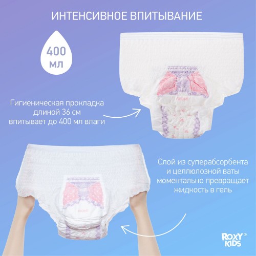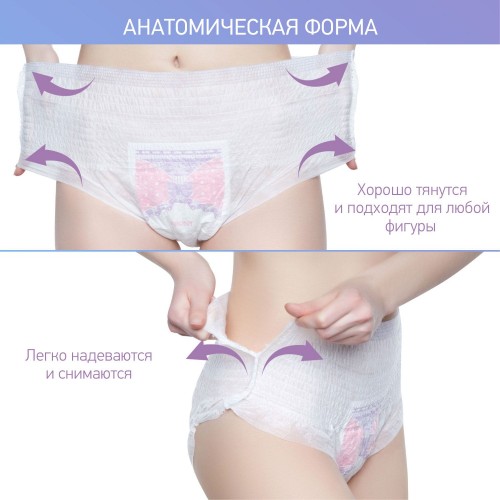 Гигиенические трусы сочетают свойства одноразовых трусов для роддома и послеродовых прокладок. Изделие адаптируется под фигуру и остается незаметным под одеждой. Трусы легко надеваются и имеют утягивающий эффект. Хлопковая текстура позволит коже дышать, а тонкая ткань и мягкие швы будут ощущаться как хлопковое нижнее белье. Дизайн трусов повторяет анатомические особенности тела. Высокие бортики обеспечат защиту от протекания со всех сторон. Гигиеническая прокладка длиной 36 см впитывает до 400 мл влаги. Впитывающий слой из суперабсорбента и целлюлозной ваты моментально превращается в гель: это позволяет надежно удержать жидкость внутри прокладки и сохранить сухость и комфорт.