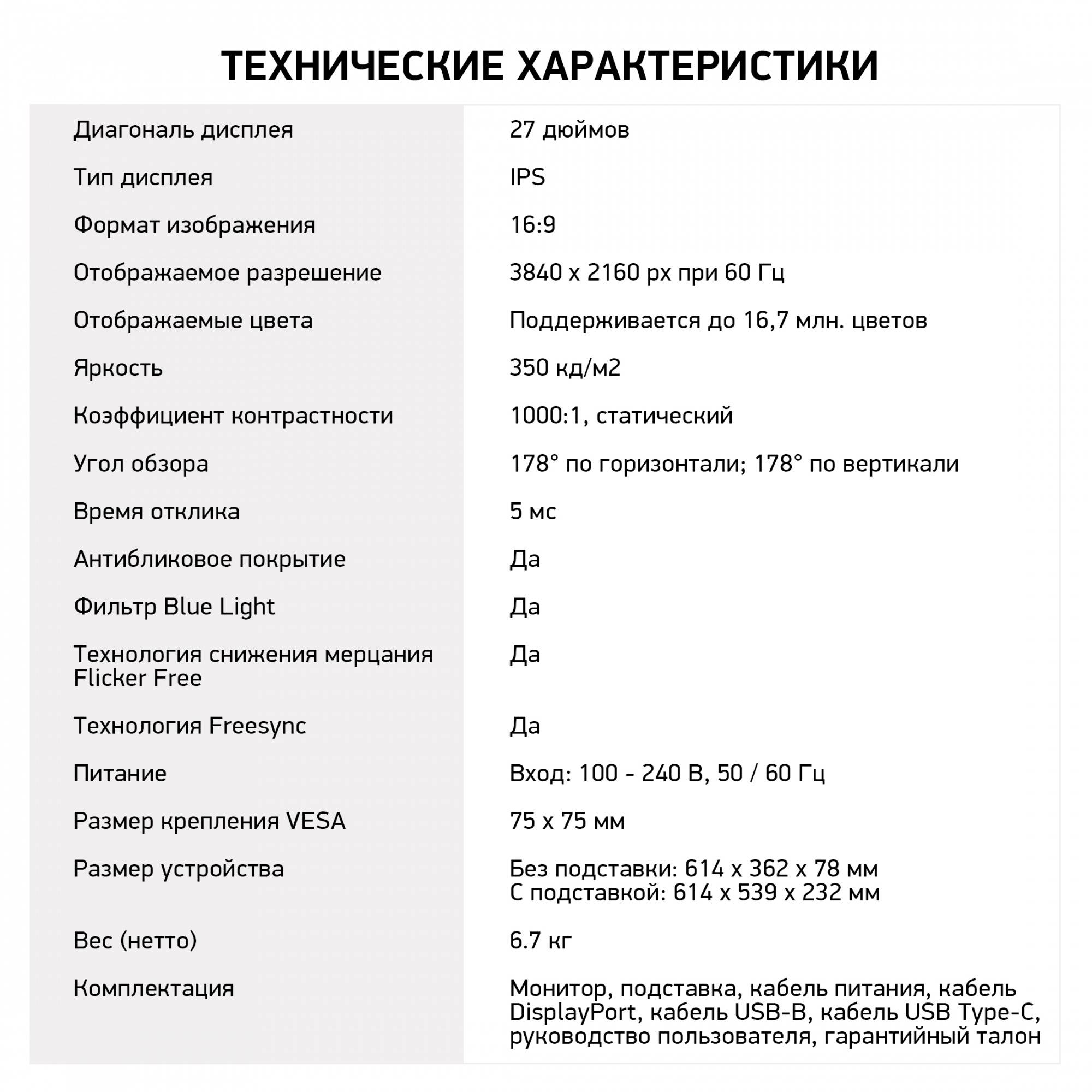 • Комплектация кабель DP, кабель USB Type-B, кабель USB Type-C (65Вт)