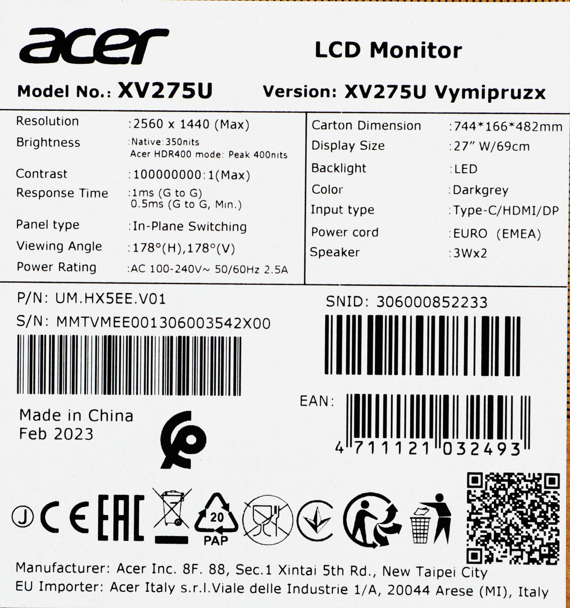 Монитор 27" Acer Nitro XV275UVYMIPRUZX, 2560х1440, 170 Гц, IPS, черный (um.hx5ee.v01)