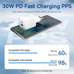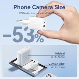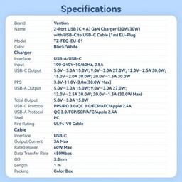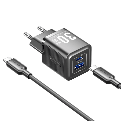 Набор для зарядки Vention з/у GaN 30W 2 порта USB (C + A) и кабель USB-C 3А Чёрный, шт.