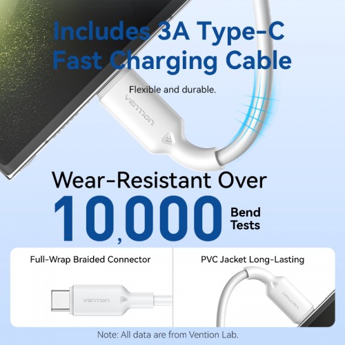 В комплект входит кабель USB-C длиной, удобной для использования, поддерживающий ток до 3А для быстрой и безопасной зарядки совместимых устройств.