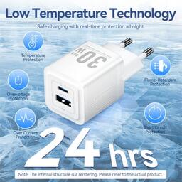 Использование GaN (галлий нитрид) обеспечивает компактные размеры, высокую эффективность и быстрое зарядное напряжение без перегрева.