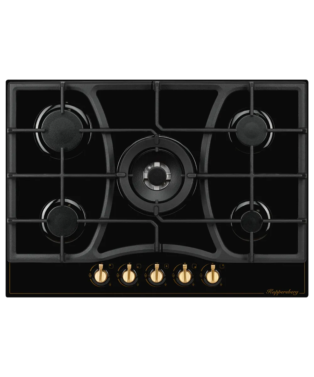 Газовая варочная поверхность Kuppersberg/ Газовая варочная поверхность, закаленное стекло, ширина 70 см, 5 газовых конфорок, WOK конфорка(3,8 кВт), автоподжиг, газ-контроль, чугунные решетки, Коллекция Classic, цвет чёрный