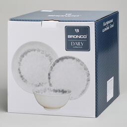 ТМ BRONCO «DAILY» - современная и стильная коллекция на каждый день. Удобные формы и размеры, нежный узор, напоминающий дымку, сделают повседневную трапезу особенной. Прекрасный подарок! Посуда выполнена из высококачественного фарфора, прошла сертификацию и безопасна для контакта с пищевыми продуктами. Можно смело использовать в микроволновой печи и мыть в посудомоечной машине.