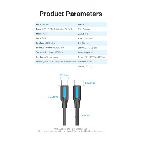 Кабель Vention COTBH — это надёжный и функциональный USB Type-C to USB Type-C кабель с продуманным дизайном и высокой производительностью. Длина 2 метра и поддержка мощности до 100 Вт делают его отличным выбором для быстрой зарядки и передачи данных.