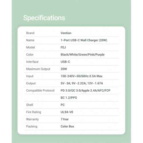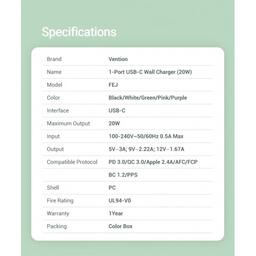 Сетевое зарядное устройство Vention FEJP0-EU оснащено одним портом USB Type-C и поддерживает мощность до 20 Вт, что позволяет быстро и эффективно заряжать совместимые устройства. Яркий розовый цвет корпуса добавляет стильности и помогает легко найти устройство среди других аксессуаров.