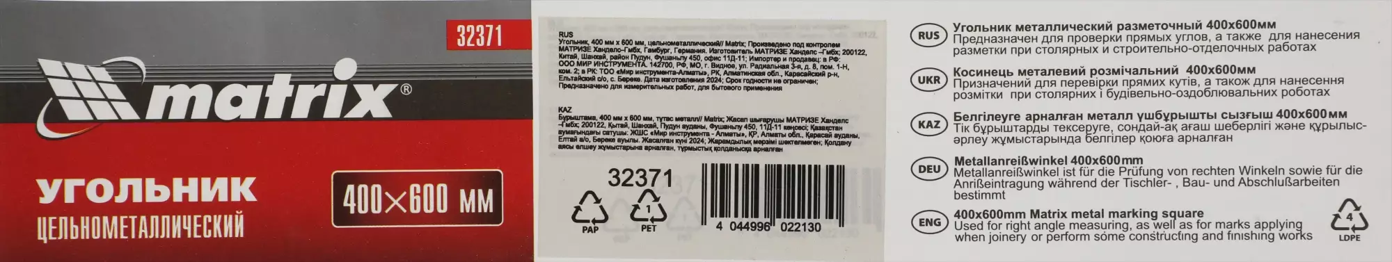 ОписаниеЦельнометаллический угольник Matrix 32371 размером 400 х 600 мм. поможет проверить прямые углы или нанести линию разметки. Он повышает точность столярных и отделочных работ. Угольник из углеродистой листовой стали горячей прокатки характеризуется повышенной прочностью.