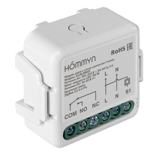 Умное реле работает в приложении Hommyn, подключается по беспроводному протоколу Zigbee 3.0, для подключения требуется Zigbee хаб - блок управления (шлюз) HOMMYN Hub HH-01 (в комплект поставки не входит).