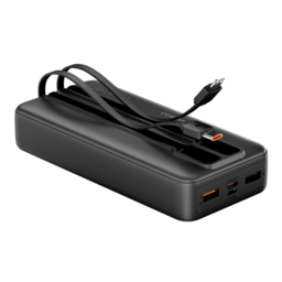 Модель оснащена встроенными кабелями USB-C и Lightning, а также двумя выходами USB Type-A и входом Micro-USB, что позволяет заряжать несколько устройств одновременно без необходимости брать с собой дополнительные провода. Power Bank совместим со смартфонами, планшетами и другими гаджетами.