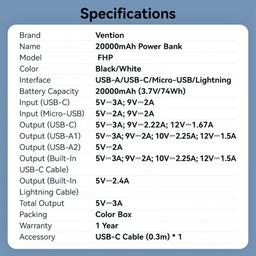 Портативный аккумулятор Vention FHPB0 — это мощный и удобный Power Bank с продуманной функциональностью и стильным дизайном. Чёрный корпус с матовой поверхностью и встроенными кабелями делает его незаменимым помощником в путешествиях, командировках и повседневной жизни.