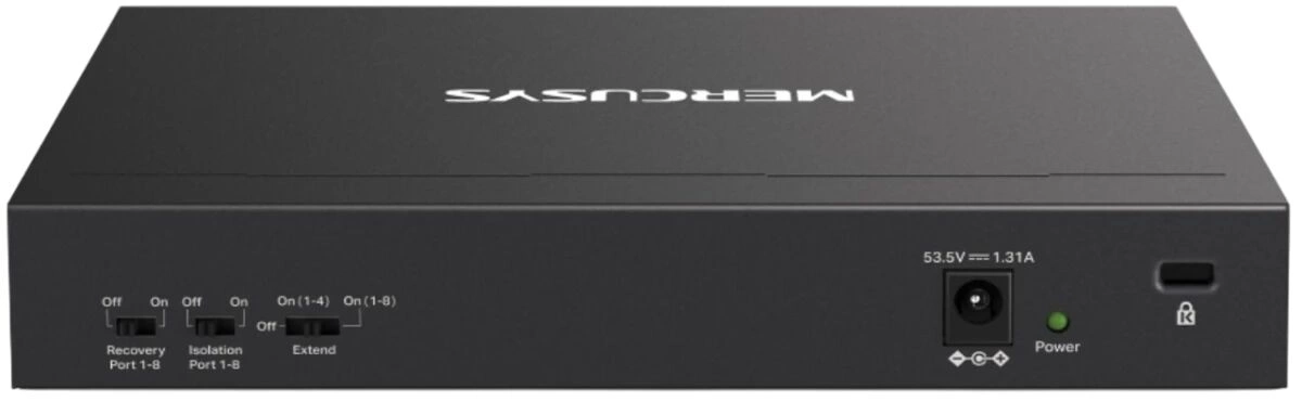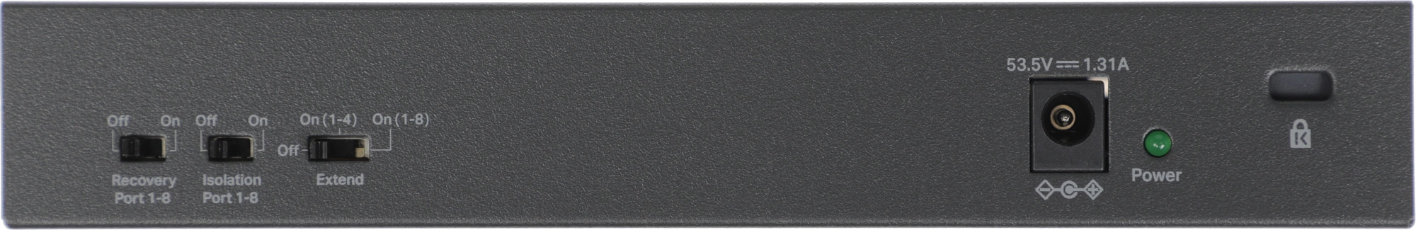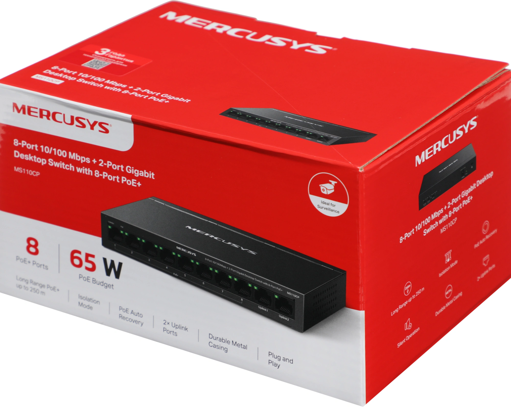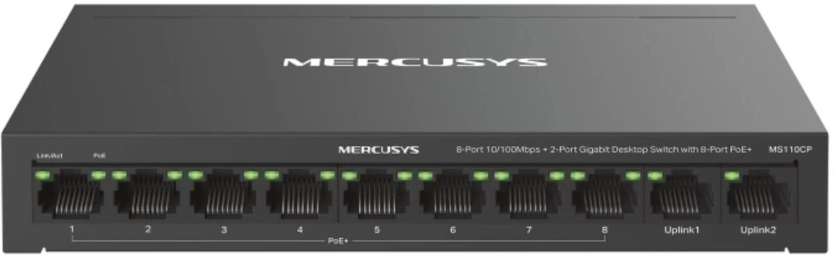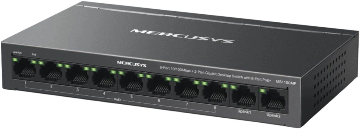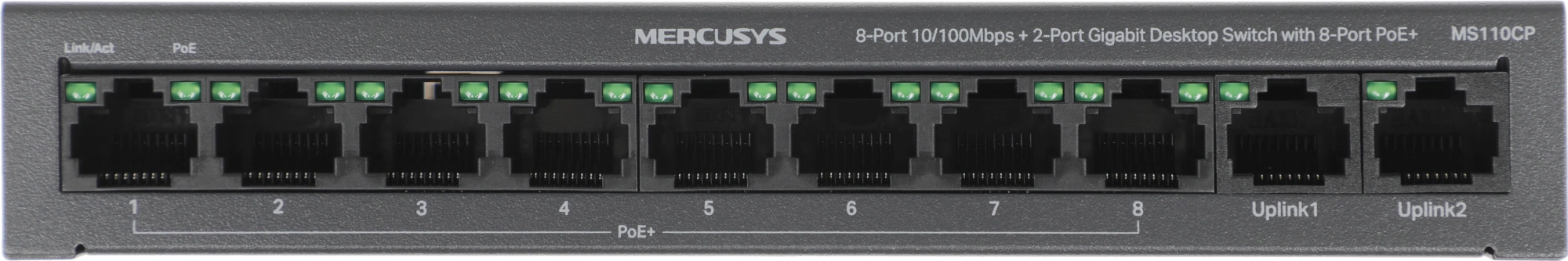 • Особенности 10 портов: 8 портов PoE+ 10/100 Мбит/c и 2 гигабитных порта без PoE