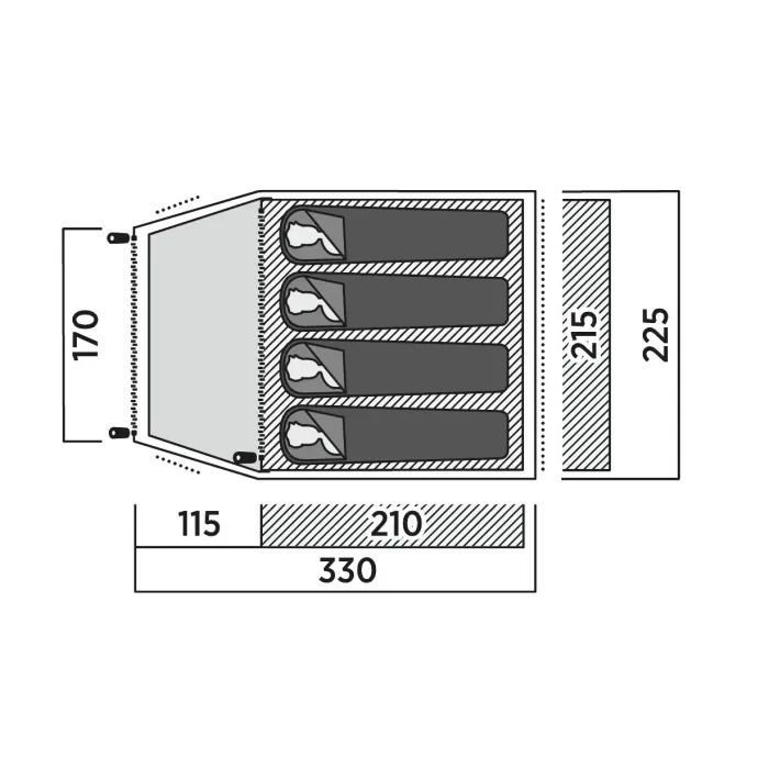 • Особливості вентиляційні отвори , сумка-чохол , дуги , кілочки , відтяжки , 2 входи , кармани для дрібних речей , гачок у центрі житлової зони для зручного кріплення освітлення , SleepTight Inner