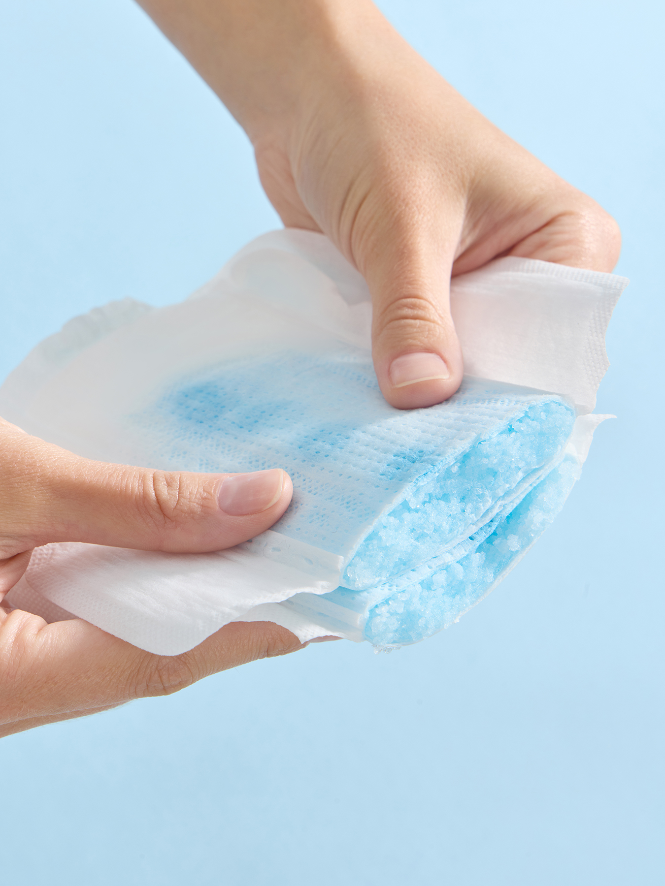 Удалив защитную бумагу с клеевой полосы, закрепить прокладку на внутренней поверхности белья; снять защитную бумагу с крылышек и зафиксировать их снаружи белья.