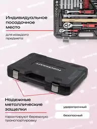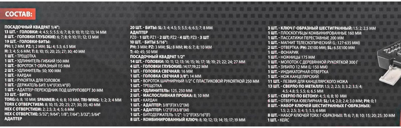 • Оснастка головки (60 шт.), сверла (18 шт.), насадки-биты (63 шт.), удлинители (5 шт.), кардан (2 шт.), держатель (2 шт.), адаптер (2 шт.)