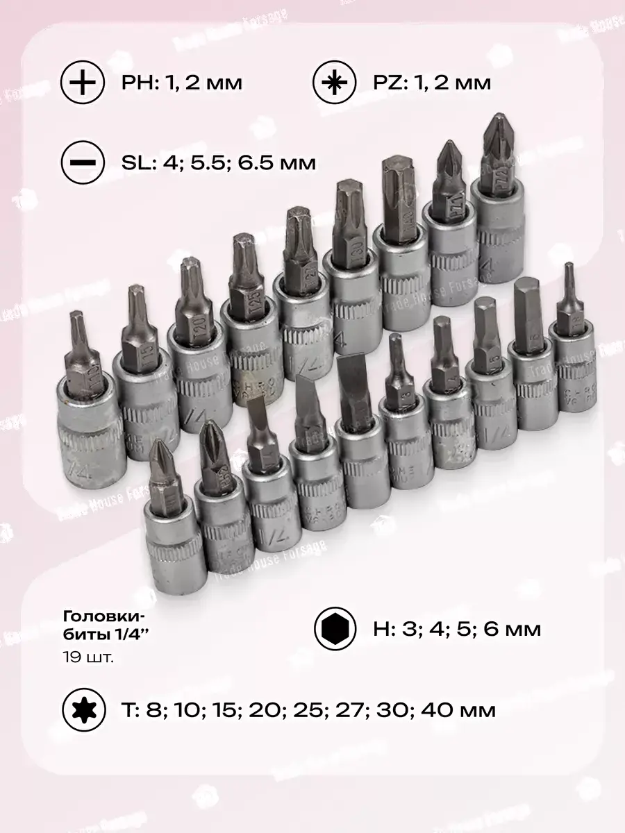 • Торцевые головки 1/2" (10, 11, 12, 13, 14, 15, 16, 17, 18, 19, 21, 22, 24, 27 мм), 1/4" (4, 4.5, 5, 5.5, 6, 7, 8, 9, 10, 11, 12, 13, 14 мм)