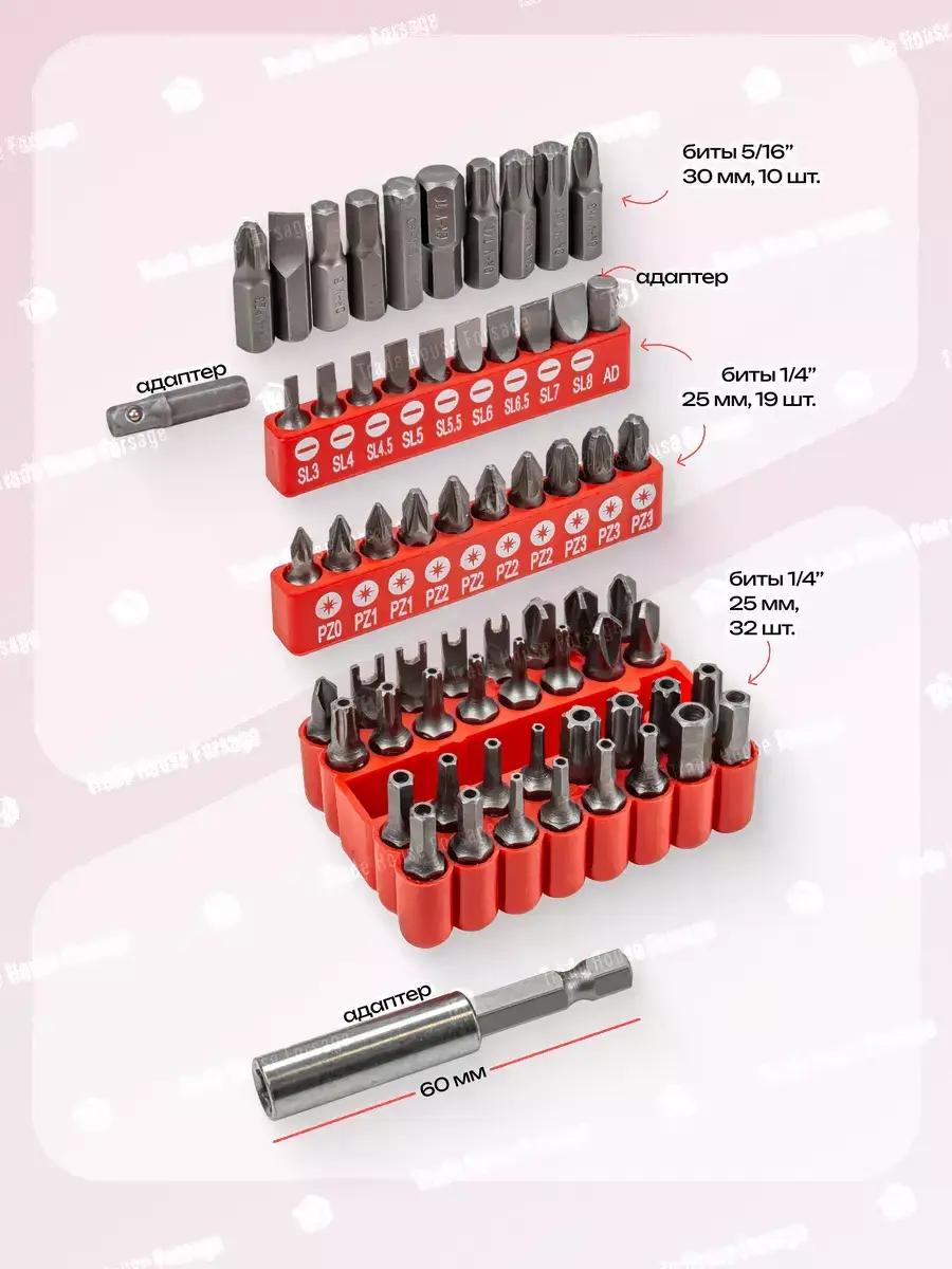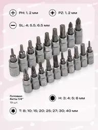 • Насадки-биты шлицевые (SL) (SL3, SL4, SL4.5, SL5, SL5.5, SL6, SL6.5, SL7, SL8), крестовые (PH) (РН3), крестовые с насечками (PZ) (PZ0, PZ1 (2 шт.), PZ2 (4 шт.), PZ3 (4 шт.)), шестигранные (Hex) (Н6, Н7, Н8, Н10), звездочкой (Torx) (Т6, Т8, Т10, Т40, Т45, Т50), звездочкой с отверстием (Torx) (Т8, Т10, Т15, Т20, Т25, Т27, Т30, Т35, Т40), шестигранные дюймовые с отверстием (5/32", 9/64", 1/8", 7/64", 3/32", 5/64"), шестигранные с отверстием (Н2, Н2.5, Н3, Н4, Н5, Н6), биты с двумя выступами (4, 6, 8, 10 мм), 3-лучевая Tri-Wing (TW) (1, 2, 3, 4 мм)