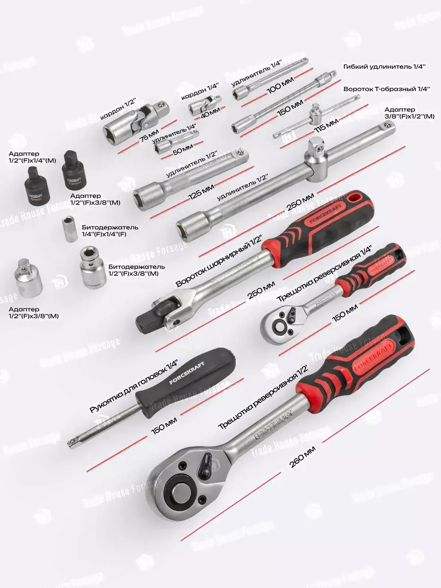 • Удлинители 1/2″ (125, 250 мм), 1/4″ (50, 100 мм), гибкий удлинитель (150 мм)