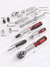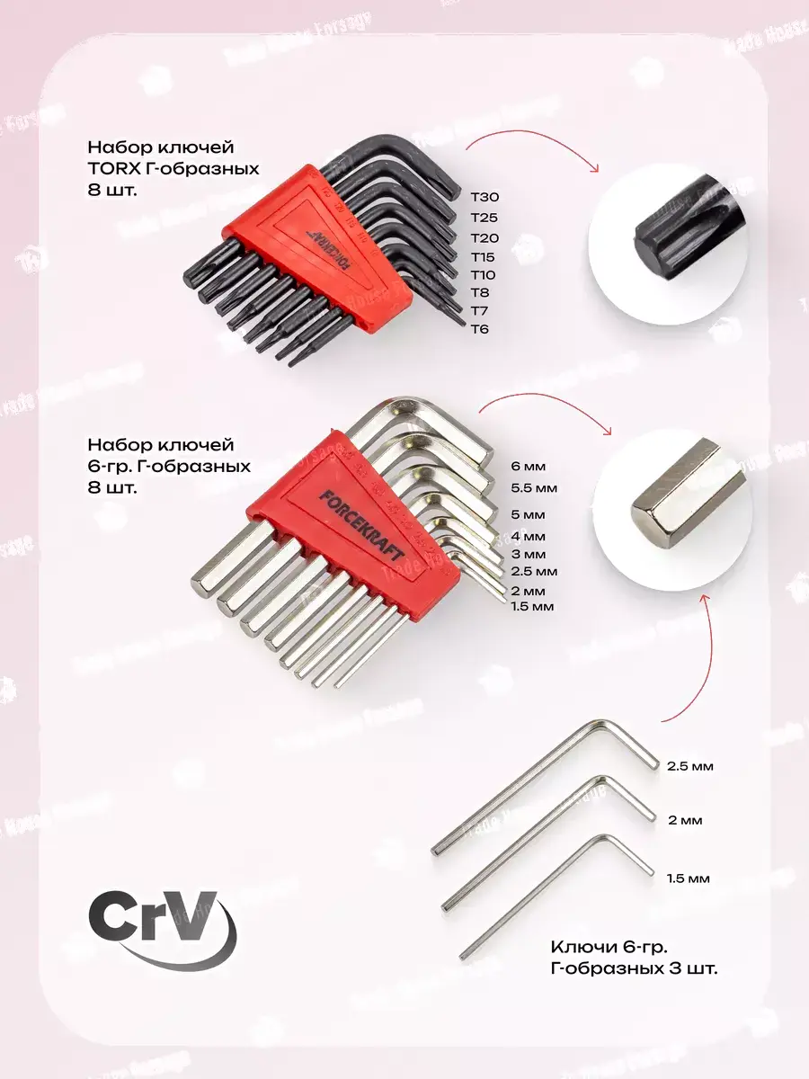 • Ключи вороток (2 шт.), комбинированный (8 шт.), угловой шестигранный (11 шт.), звездочкой (Torx) (8 шт.)