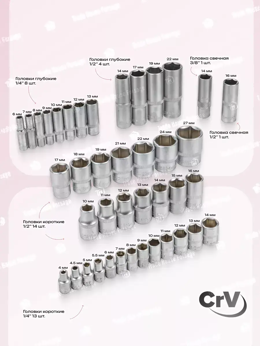 • Головки торцевые (27 шт.), глубокие торцевые (12 шт.), свечные (2 шт.), головки со вставкой (19 шт.)