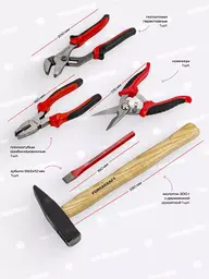 • Инструменты в наборе трещотка (2 шт.), отвертка (9 шт.), пассатижи (1 шт.), плоскогубцы (1 шт.), молоток (1 шт.), ножницы (1 шт.), нож (1 шт.), зубило (1 шт.), ключ гаечный (29 шт.)