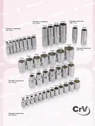• Глубокие торцевые головки 1/2″ (14, 17, 19, 22 мм), 1/4″ (6, 7, 8, 9, 10, 11, 12, 13 мм)