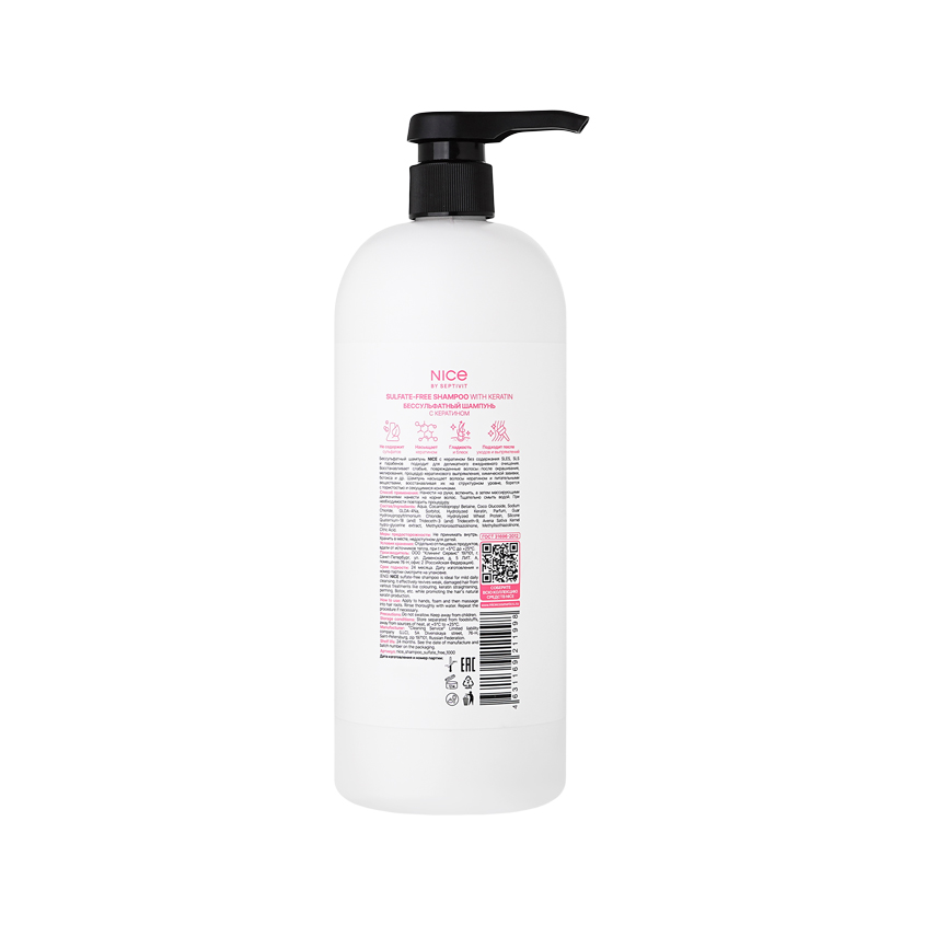 Бессульфатный шампунь NICE с кератином без содержания SLES, SLS и парабенов подходит для деликатного ежедневного очищения.