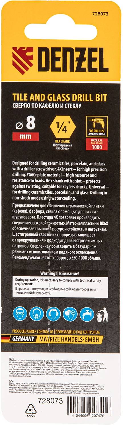 Сверло Denzel 728073 по плитке Д=8мм (1пред.) для дрелей
