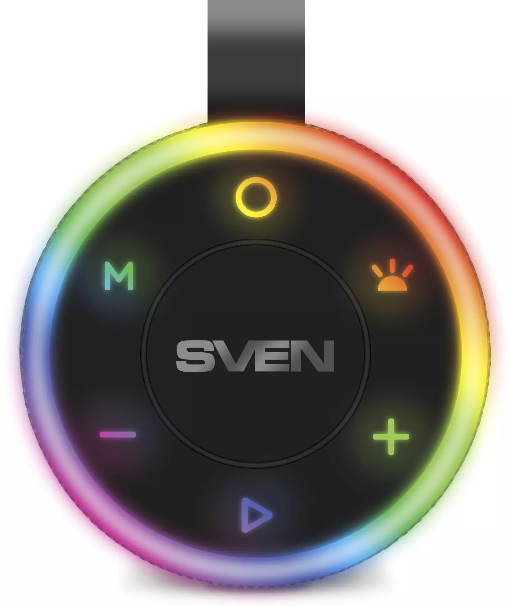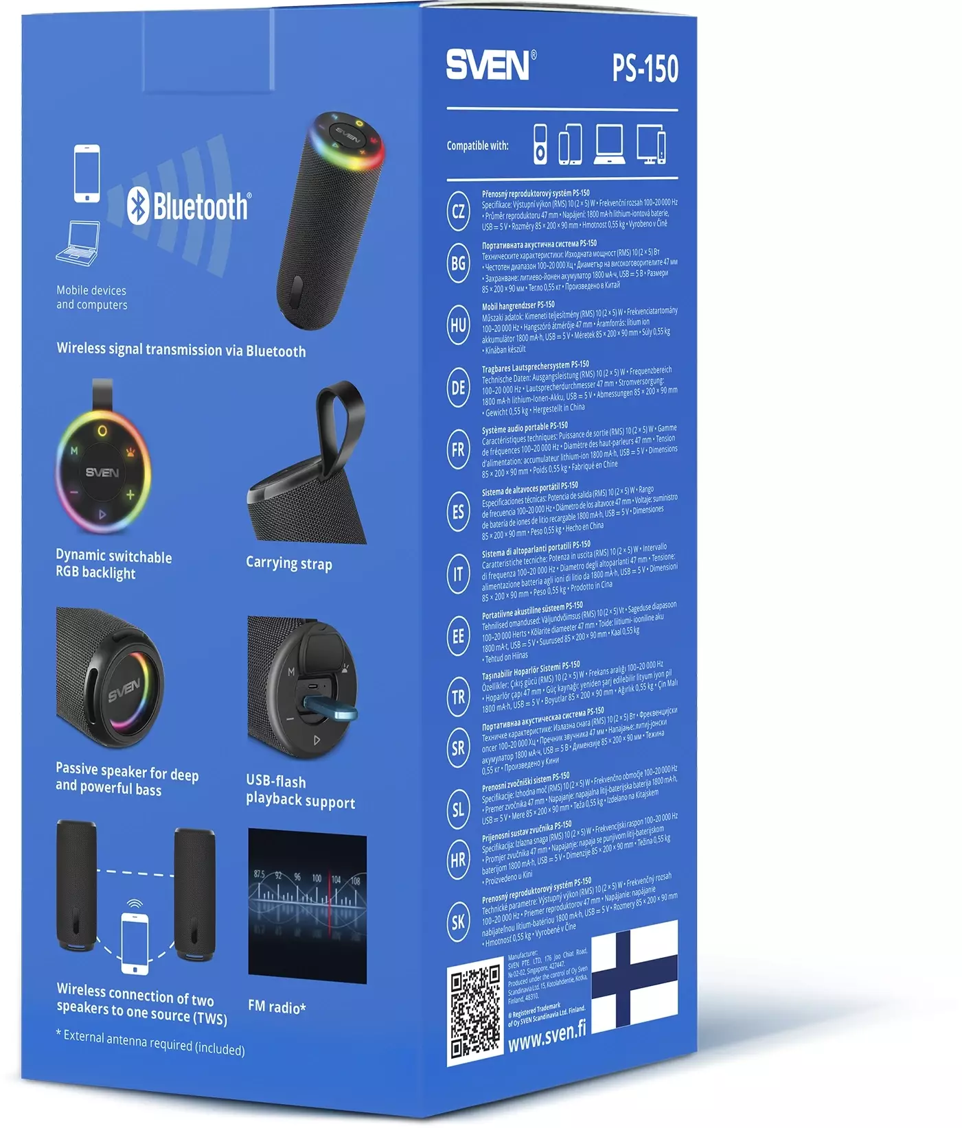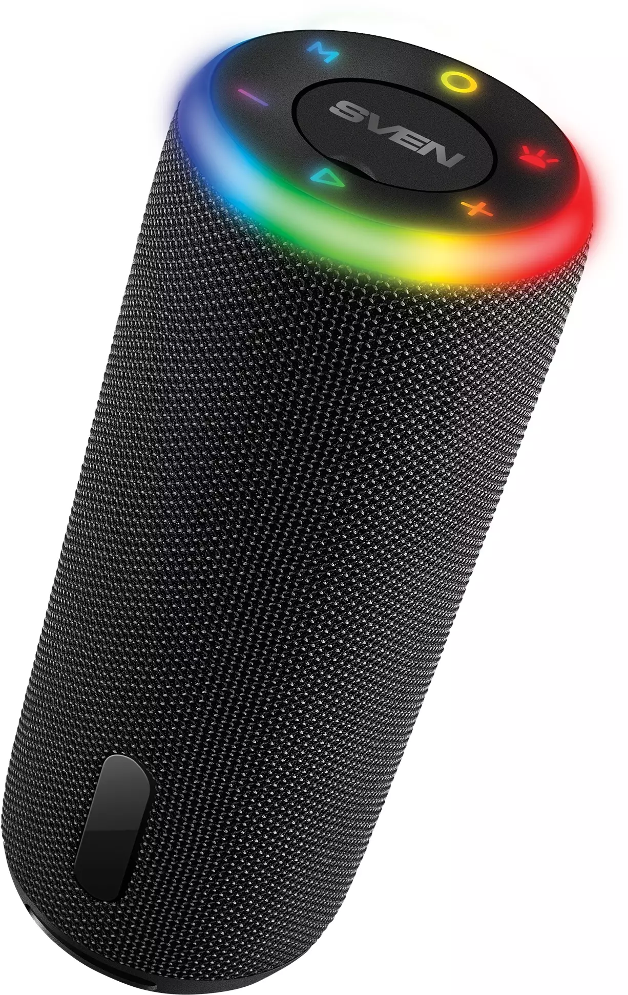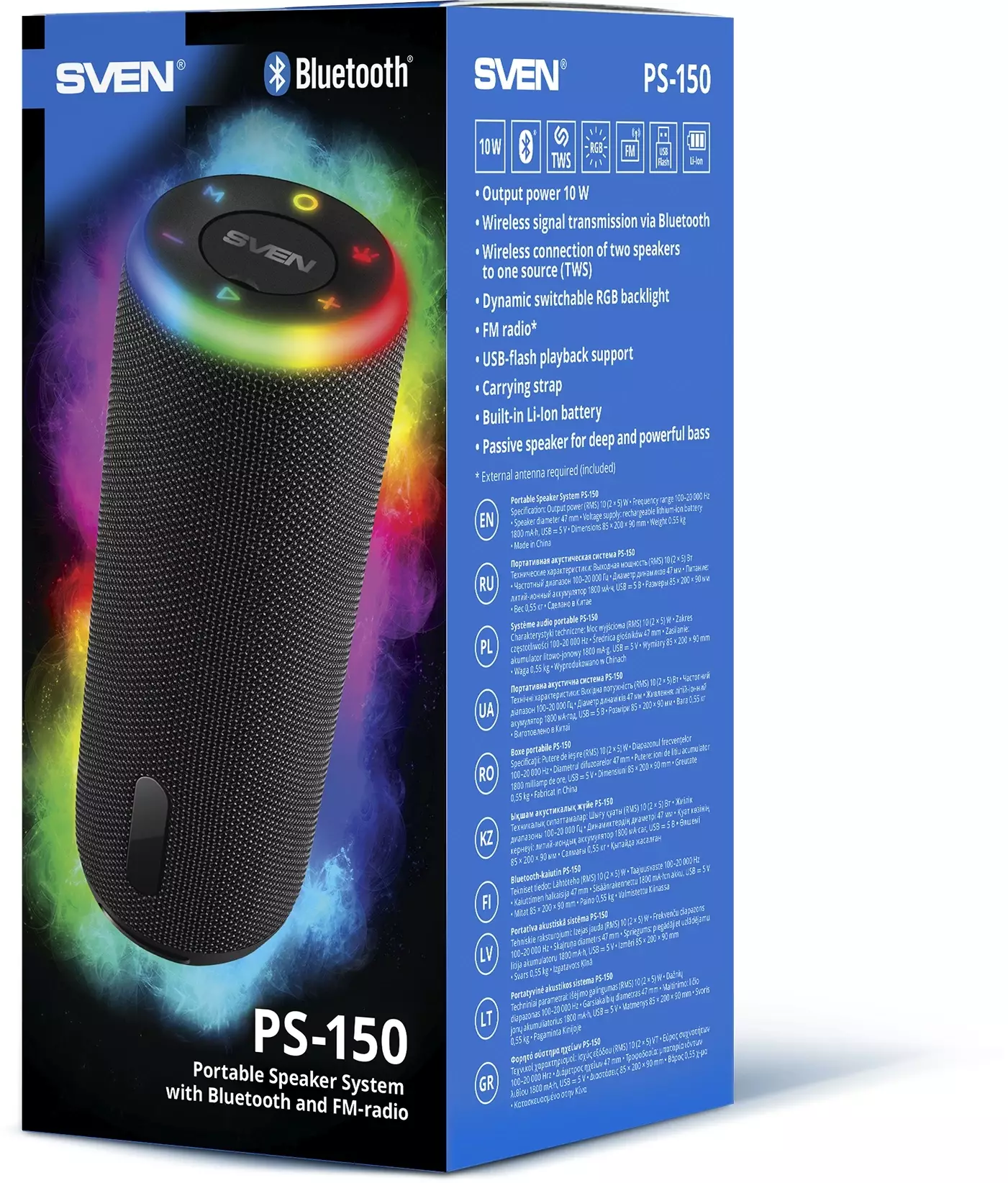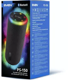 ОсобенностиВнешние источники звука подключаются к портативной акустике посредством Bluetooth, причем к одному гаджету можно подключить сразу две колонки для достижения большей громкости, получения стереоэффекта и еще более эффектной подсветки. Совместимость в режиме TWS- SVEN PS-150