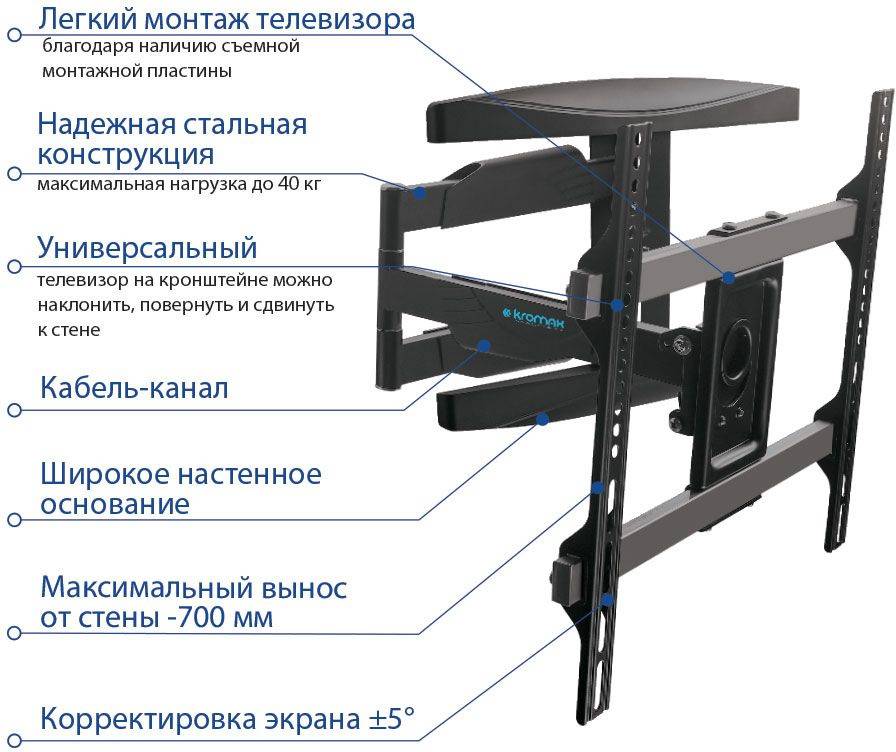 • Особенности Легкий монтаж телевизора благодаря наличию съемной монтажной пластины, корректировка экрана ±5 градусов, широкое настенное основание, надежная стальная конструкция.
