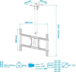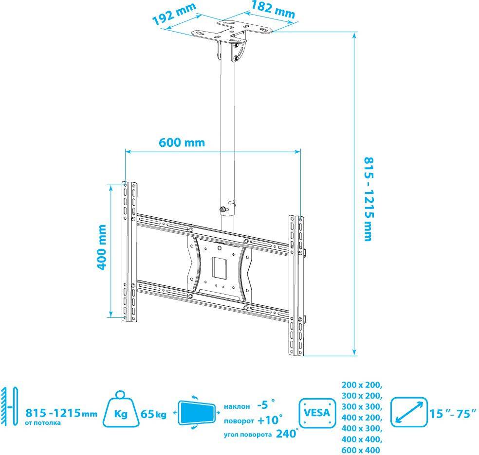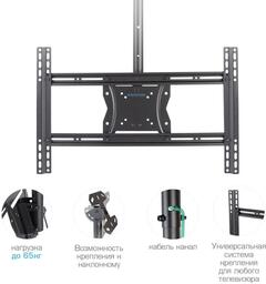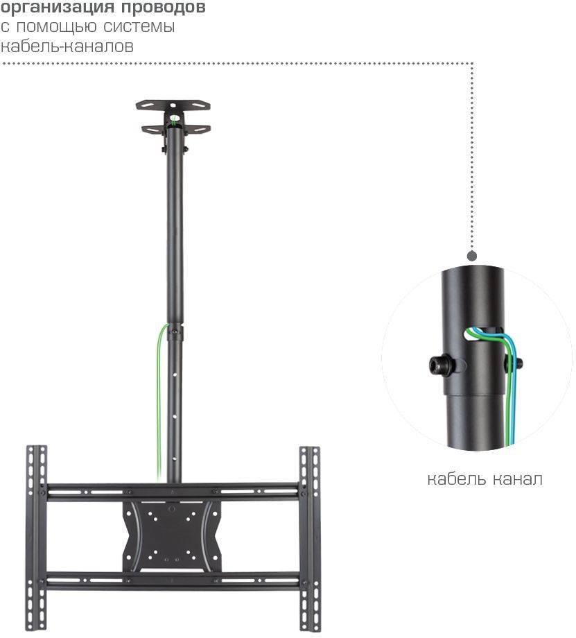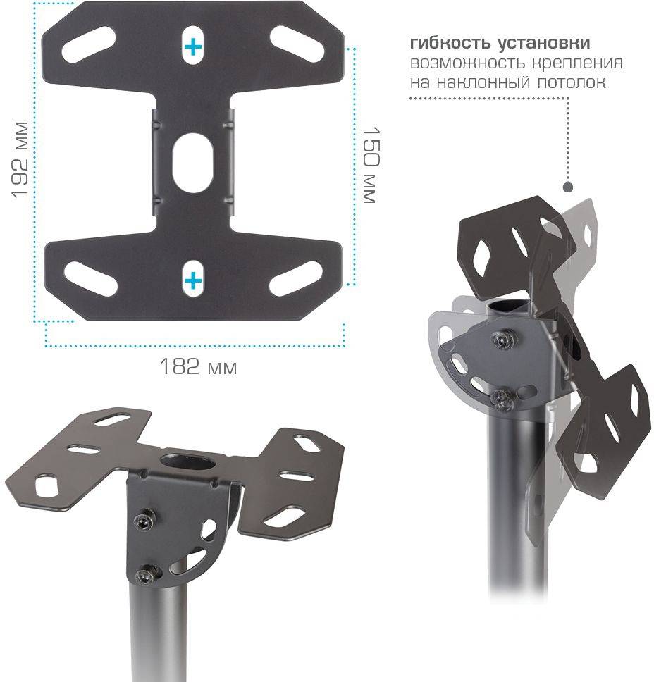 ОсобенностиВозможность крепления к наклонному потолку. Надежная стальная конструкция. Кабель-канал. Максимальная степень подвижности. Легкая регулировка