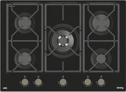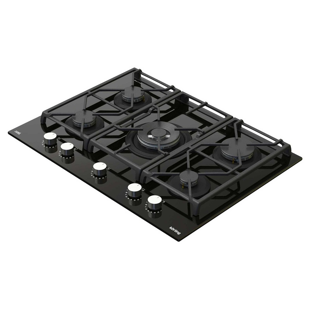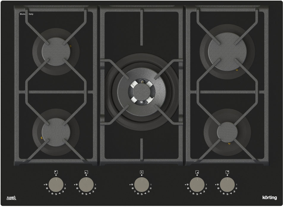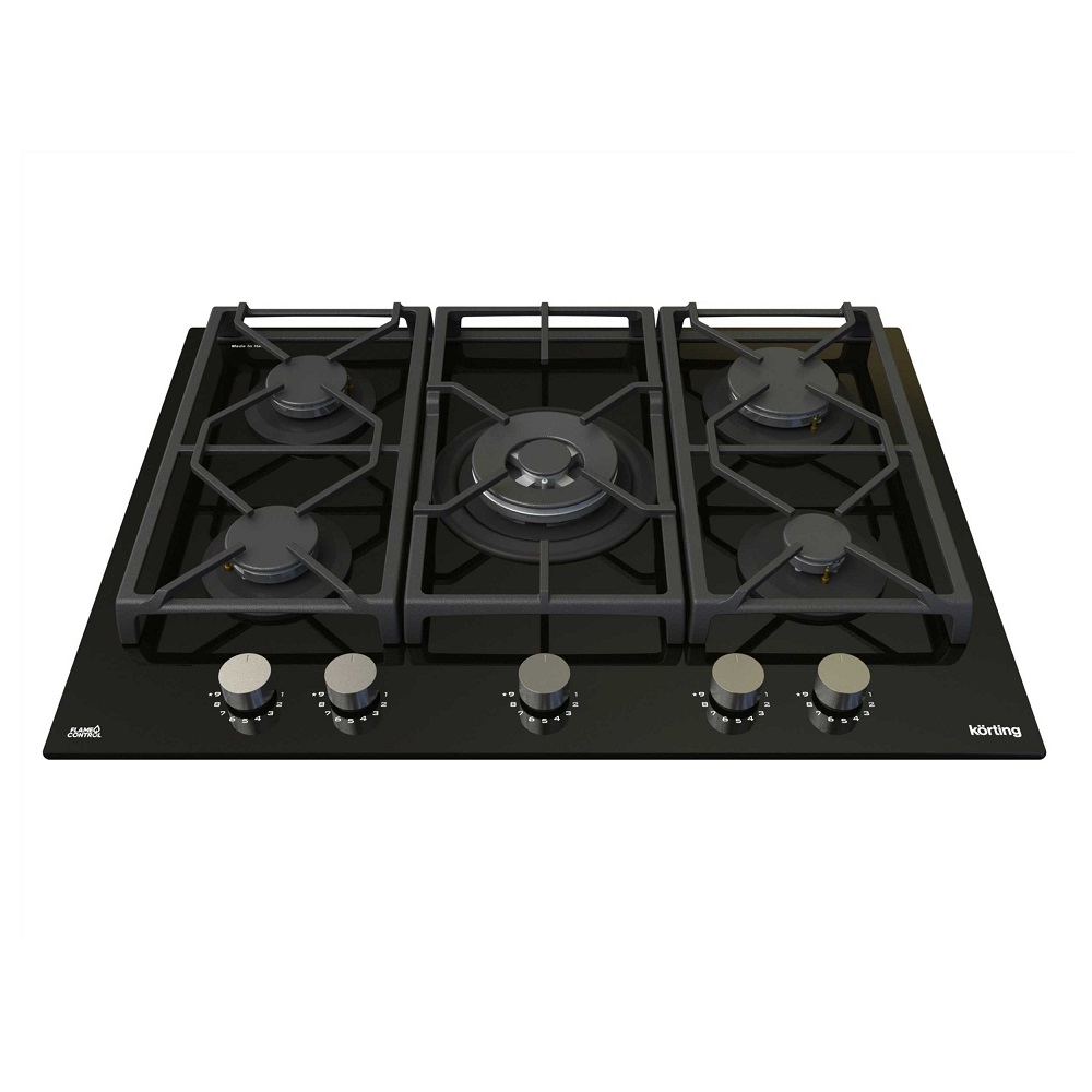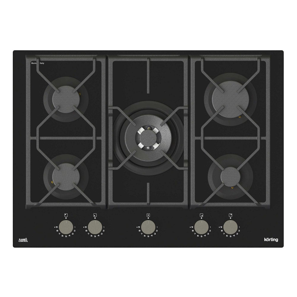 Встраиваемая варочная панель Korting/ Газовая варочная панель из закаленного стекла шириной 70 см, 5 высокоэффективных конфорок, WOK-сверхмощная конфорка с тройным рядом пламени, технология точной регулировки мощности пламени в 9-ти положениях Flame Control, автоматический электроподжиг, газ-контроль каждой конфорки, переднее расположение поворотных регуляторов, металлические регуляторы, цельные чугунные решетки, в комплекте - подставка WOK, цвет - черное стекло