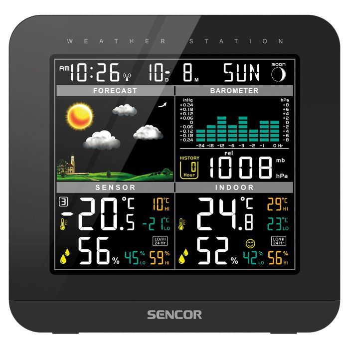 Додаткові характеристикиіндикатор низького заряду батареї датчика , цифровий час, дата та день тижня , атмосферний тиск у відносних або абсолютних значеннях , графік барометричного тиску , показники температури та вологості в приміщенні , індикація рівня комфорту , показники зовнішньої температури та вологості , прогноз на 12–24 години , будильник та повтор , годинник , 3 рівня яскравості дисплея , підтримує до 3 датчиків , можливість вибору 12- чи 24-часового формату , фази місяця , відображення температури з °c/°f за вибором