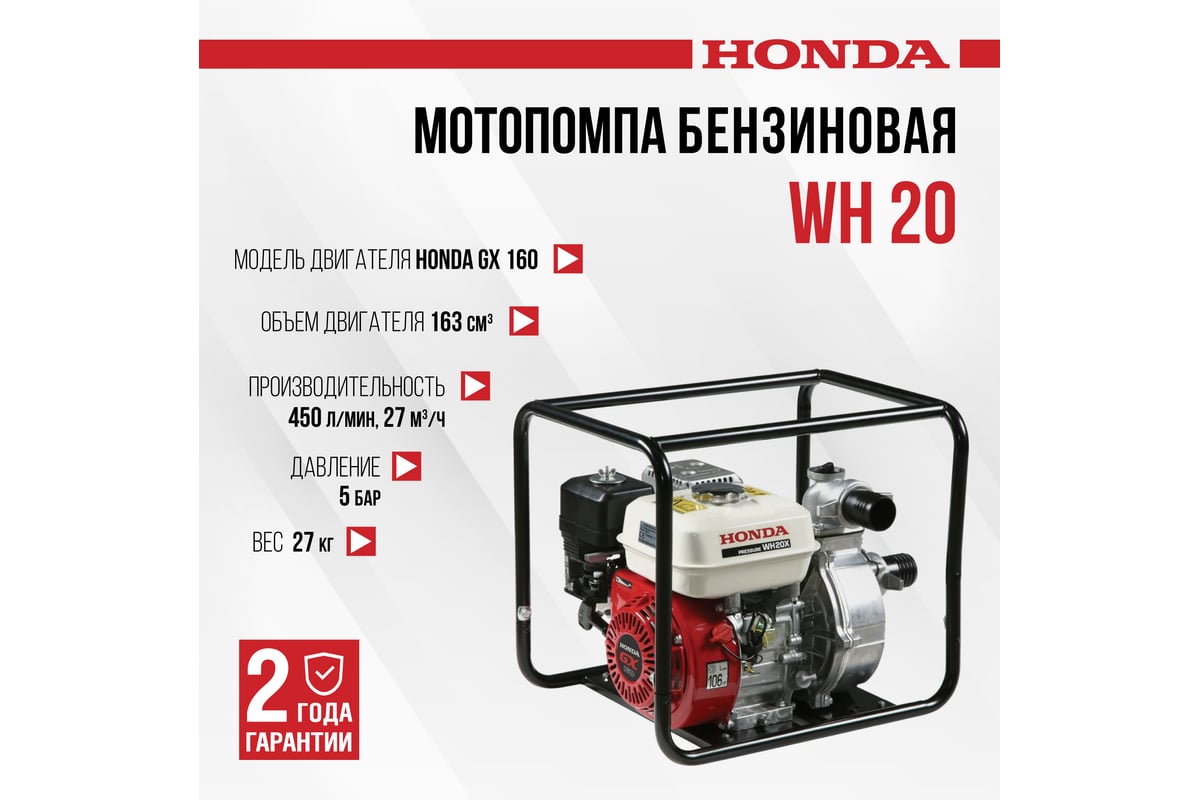 Бензиновая мотопомпа Honda WH 20 XT WH20XTTFX предназначена для перекачки чистой и слабозагрязненной воды, что делает ее универсальным решением для различных задач. Она оснащена мощным 4-тактным двигателем Honda GX160Т объемом 163 куб.см, который обеспечивает надежную и стабильную работу. Высота подъема воды достигает 45 метров, а высота всасывания составляет 8 метров, что позволяет использовать мотопомпу в различных условиях. Производительность устройства составляет 450 литров в минуту, что обеспечивает быструю и эффективную перекачку воды. Диаметр входного и выходного отверстий равен 50 мм, что способствует высокой пропускной способности. Мотопомпа оснащена ручным стартером и имеет прочную раму для удобства транспортировки. Ее компактные размеры и вес 27 кг делают ее удобной для переноски и использования в полевых условиях.