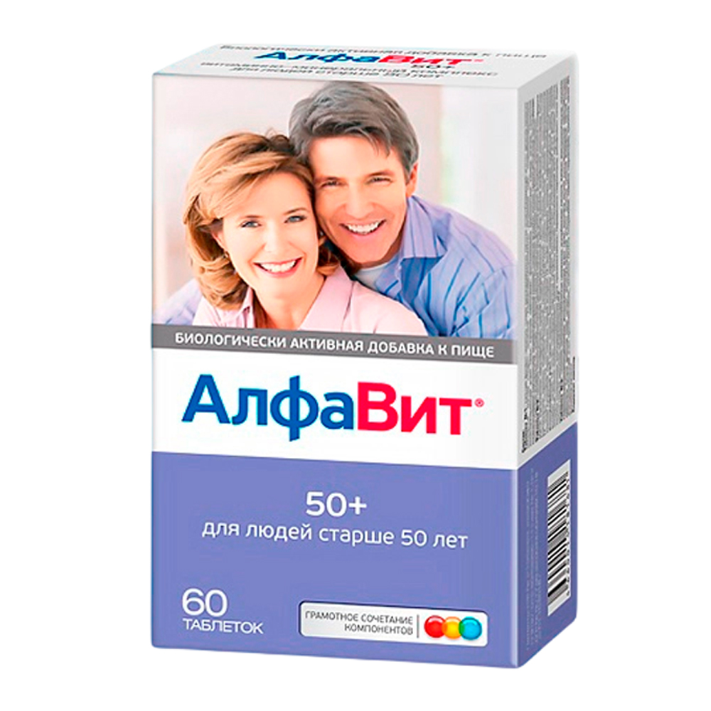 Алфавит 50+ – витаминно-минеральный комплекс для людей старше 50 лет, разработанный с учетом возрастных потребностей организма. Содержит 13 витаминов, 9 минералов и каротиноиды в оптимальных дозировках, включая повышенное содержание кальция, витамина D3 и лютеина для поддержания здоровья костей, зрения и сердечно-сосудистой системы. <br>