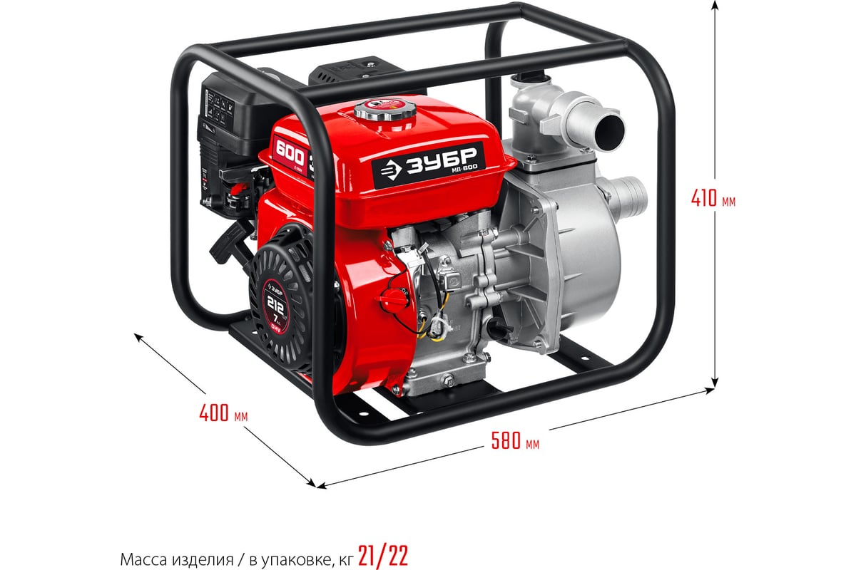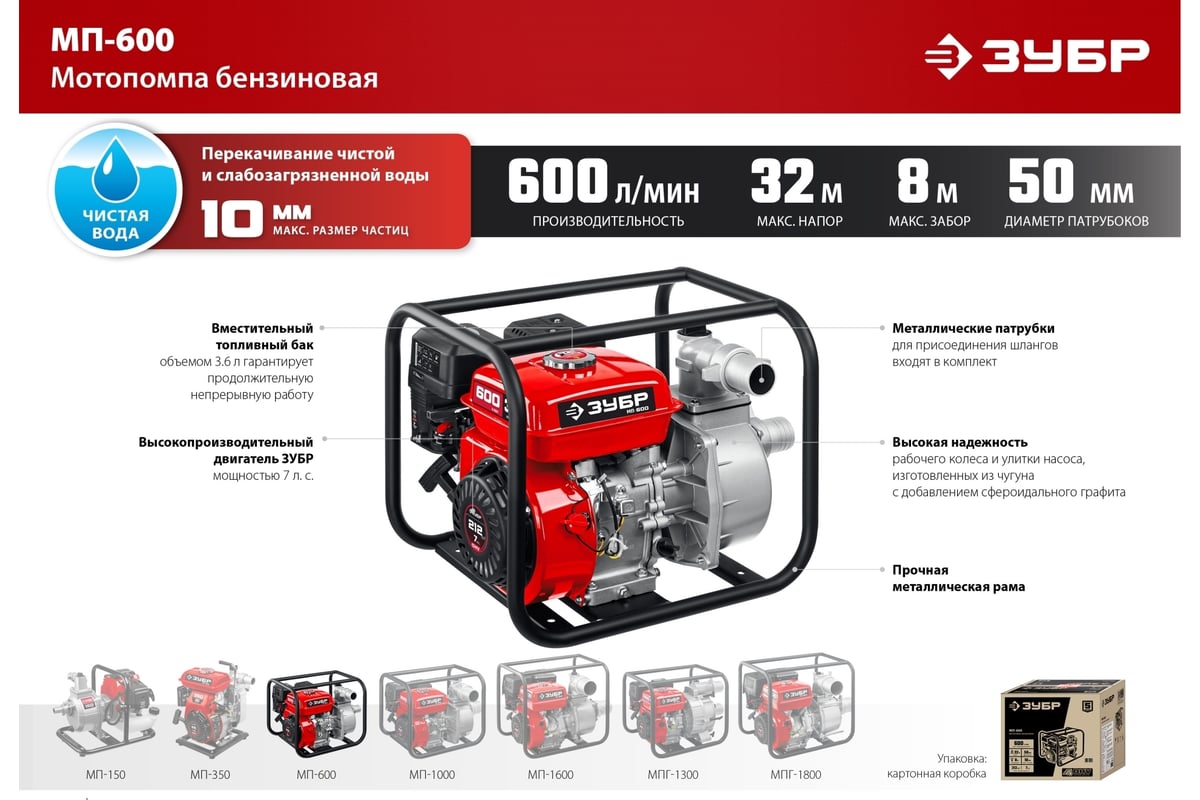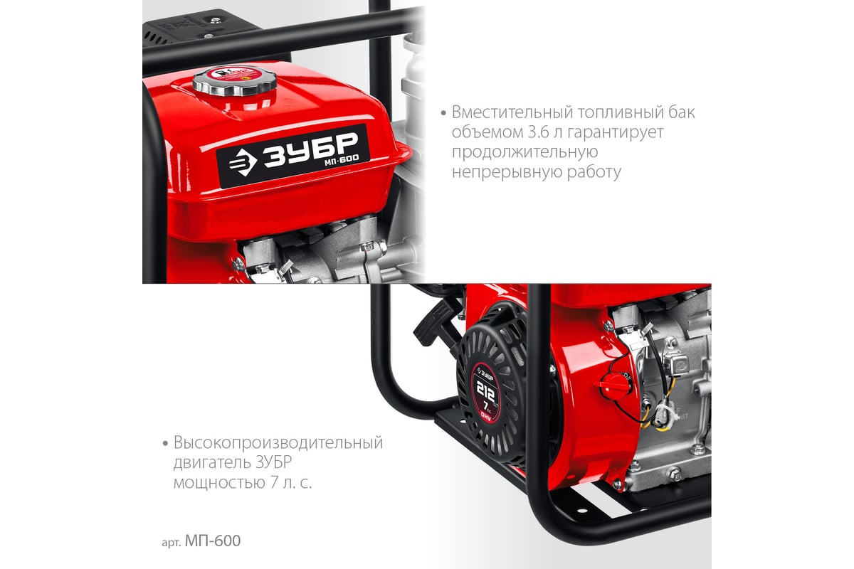 Бензиновая мотопомпа ЗУБР МП-600 предназначена для откачки (перекачки) воды из водоемов, подвалов, котлованов, емкостей и т.п. Также может использоваться в качестве нагнетающего агрегата для подачи воды при организации полива, заправки емкостей и т.п.