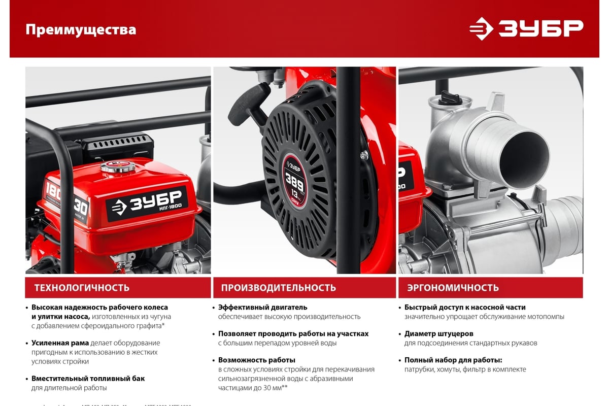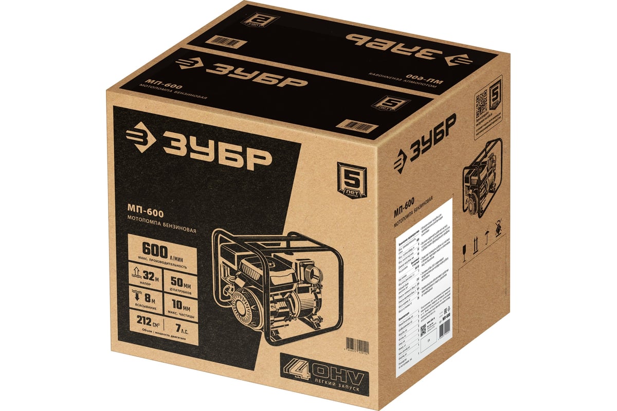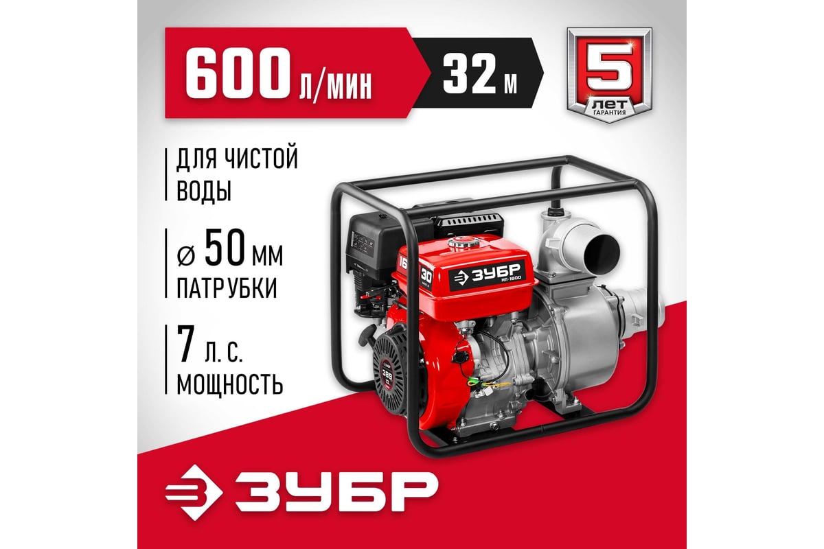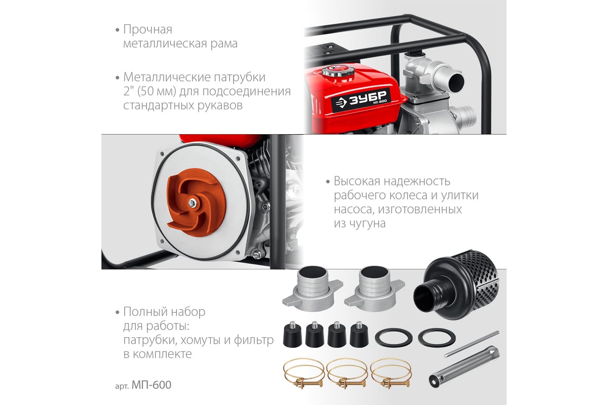 Бензиновая мотопомпа ЗУБР МП-600 предназначена для откачки (перекачки) воды из водоемов, подвалов, котлованов, емкостей и т.п. Также может использоваться в качестве нагнетающего агрегата для подачи воды при организации полива, заправки емкостей и т.п.