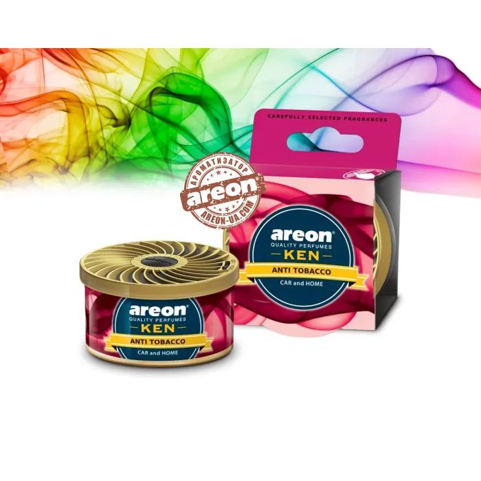 Ароматизатор від бренду AREON моделі KEN Antitobacco необхідний для розповсюдження приємного запаху в салоні транспортного засобу, завдяки чому приглушає різноманітні неприємні запахи, та забезпечує впевненість та врівноваження під час поїздки. Ця серія ароматизаторів має оригінальну форму виконання, включаючи різні екстракти запахів та різні кольори. Дає можливість розповсюдження приємного запаху цілодобово, ароматизатор має тривалий термін експлуатації. Такий аксесуар в салон може використовуватися для ароматизації як в якості парфюма в автомобілі, так і в якості освіжувача повітря будь-де. Не рекомендується постійне стикання з різноманітними пластмасовими деталями та елементами салону автомобіля.