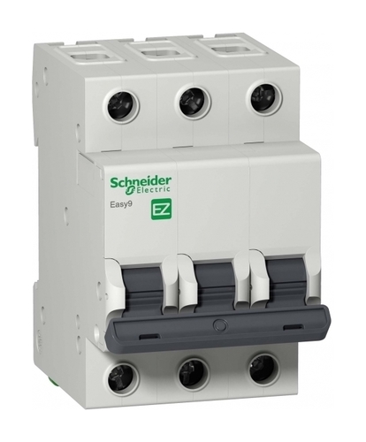 Автоматический выключатель серии Easy9 Schneider Electric, 3-полюсный, номинальный ток 25 А, характеристика В, Icn = 4.5 кА. - Применяется в трехфазных сетях напряжением до 400 В.- Предназначен для защиты от перегрузок и КЗ.- Характеристика типа В (3-5 In) обеспечивает защиту линий с малыми токами КЗ, например, линий большой длины и электронного оборудования.- Оснащен механизмом «мгновенного включения».- Ударопрочный корпус из специального пластика с 6 металлическими заклепками.