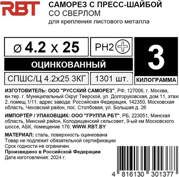 Саморез RBT СПШС/Ц 4.2х25 с прессшайбой со сверлом мелкий шаг