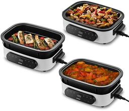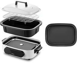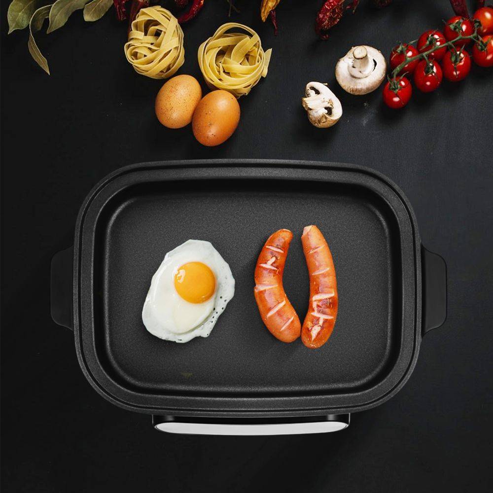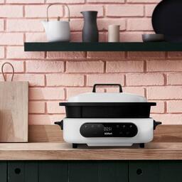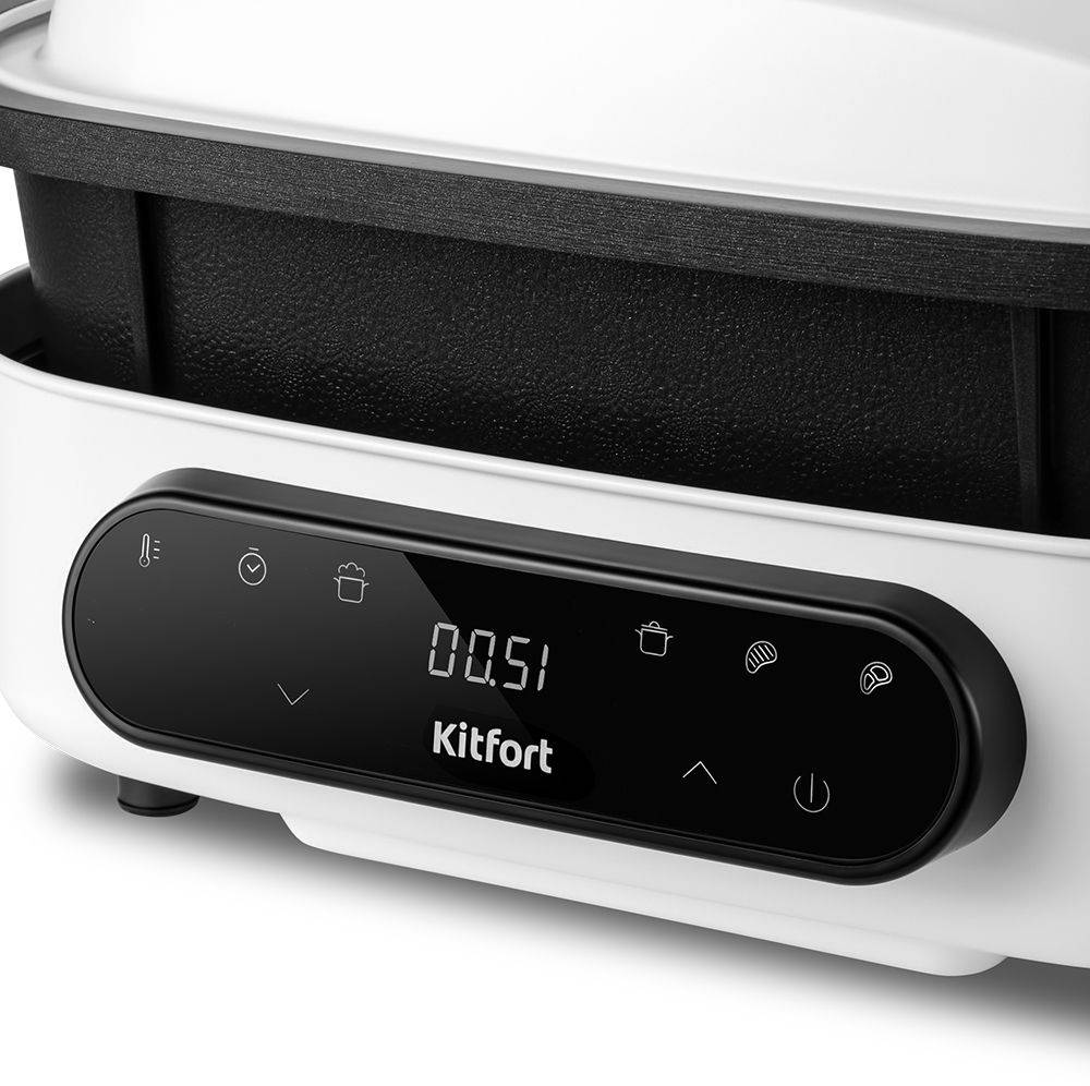 ОсобенностиЭлектросковорода оснащена дисплеем и сенсорной панелью управления, с помощью которой можно выставить нужную программу приготовления, регулировать мощность и время. Мощность регулируется ступенчато в диапазоне от 300 Вт до 1200 Вт. Емкость сковороды - 1,6 л.